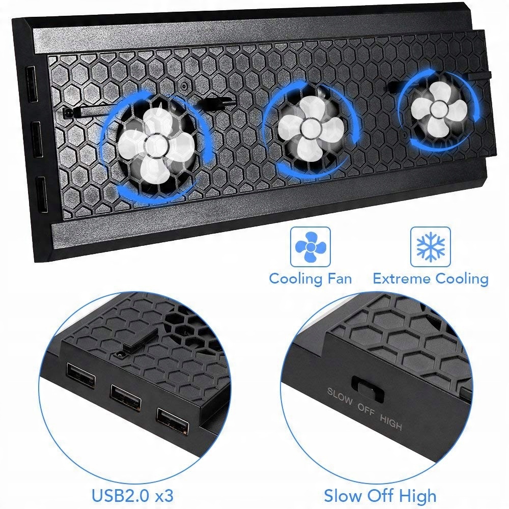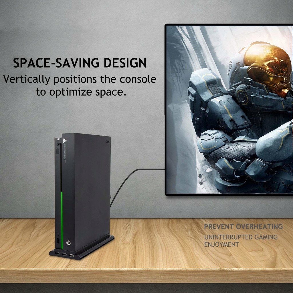 Вертикальна підставка з 3 вентиляторами охолодження, яка охолоджує Xbox One X, коли розміщується в охолоджувальній пластині. Ви уникнете перегріву консолі та спалюйте на слідах на столі. Охолоджуюча підставка оснащена трьома портами USB 2.0 для управління зарядкою, клавіатурою, мобільним телефоном, планшетним ПК та іншими USB -пристроями. Увага! Тільки для зарядки не підключайте зовнішній жорсткий диск через USB -порти