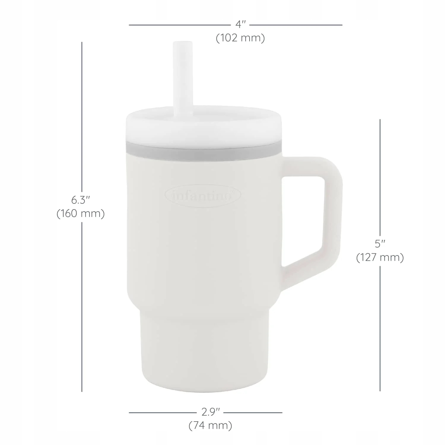 Зустрічайте Infantino My 1st Tumbler, ідеальний помічник для підтримки вологи вашої дитини! Ця чарівна чашка на 266 мл призначена для немовлят, які тільки починають пити самостійно. Виготовлений з легкого, 100% високоякісного силікону, він ідеально лежить у маленьких ручках. Герметична соломинка, що складається з двох частин, включає розумний клапан, який забезпечує плавний потік рідини та запобігає проливанню, навіть якщо чашка перевернута. Соломинка, що не висувається, має м’який силіконовий наконечник, що робить її ідеальною для тих перших дорогоцінних ковтків. Він також має ручку для зручного перенесення та підходить до більшості підстаканників, тому завжди під рукою. Очищення просте: розберіть і помістіть його на верхню полицю посудомийної машини або вимийте вручну теплою водою з милом.