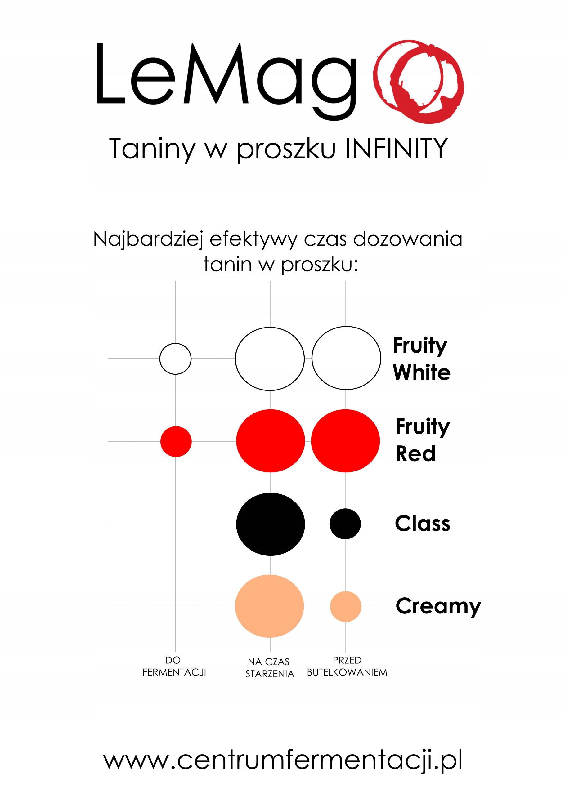 Суміш рослинних танінів, призначена для ревіталізації червоних вин. Додавання INFINITY Fruity Red особливо рекомендується на етапі витримки/визрівання вина та безпосередньо перед розливом у пляшки, але його також можна використовувати на етапі бродіння.