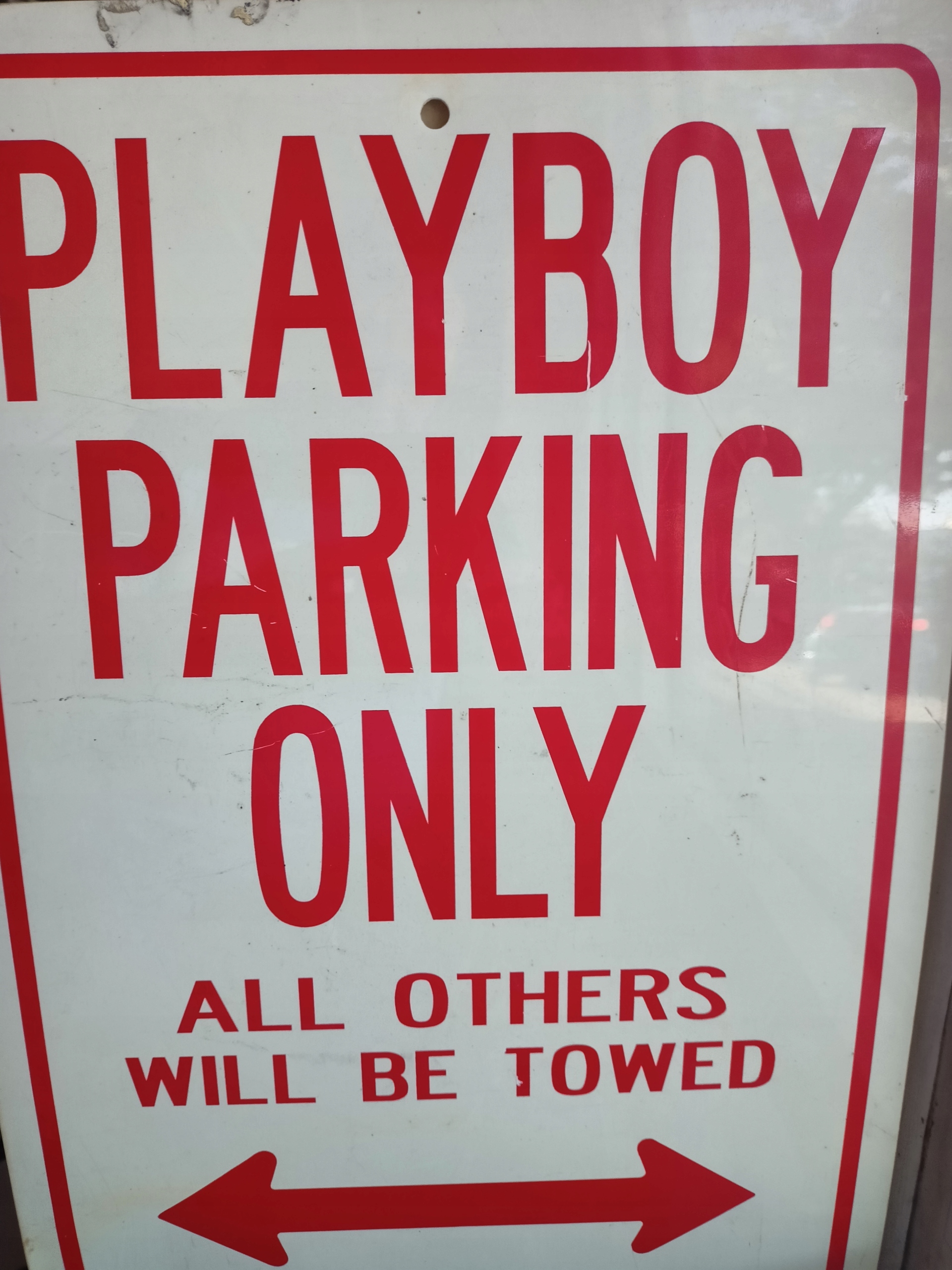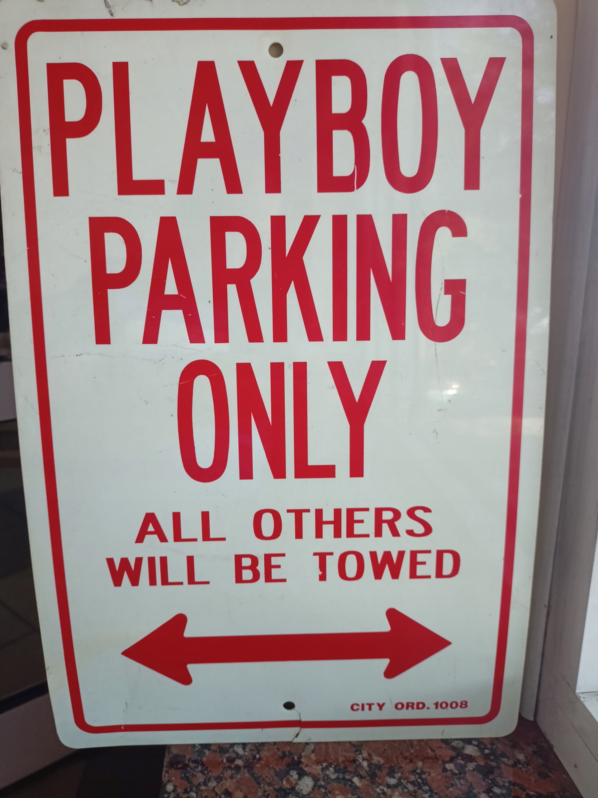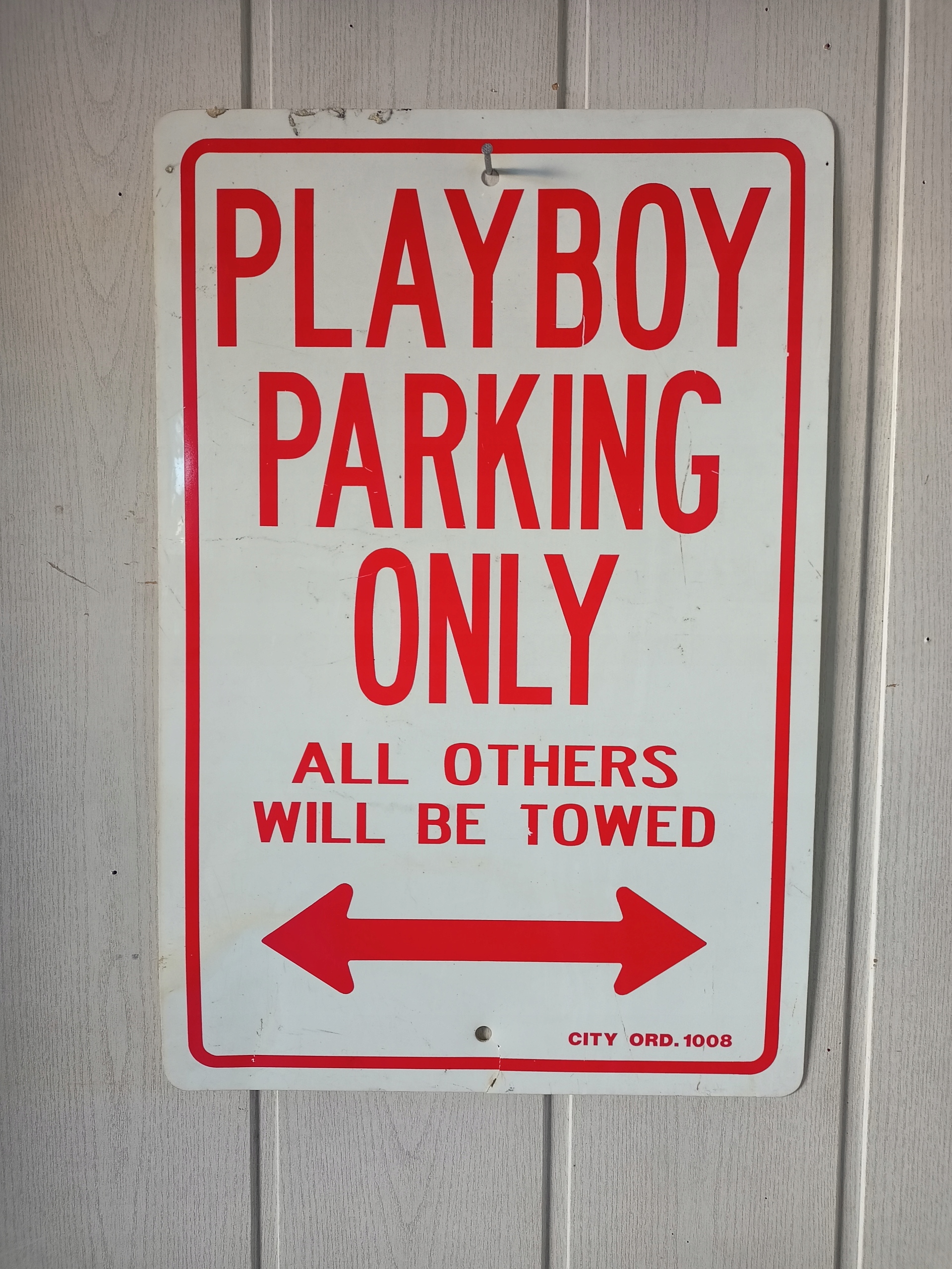 - Оригінальна американська дошка "Playboy Parking Тільки всі інші будуть буксируватися містом Орд.1008" - Паркінг Тільки Playboy, які всі інші транспортні засоби будуть буксируватися містом RZ.1008. Два кріпильні отвори. На нижньому на фотографії видно тріщину.