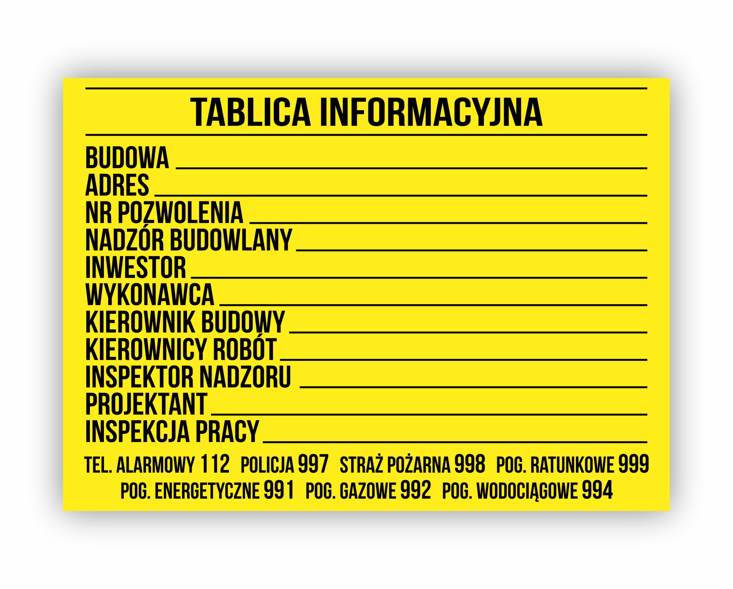 Дошка відповідає вимогам, зазначеним у главі 3 Постанови Міністра інфраструктури від 26 червня 2002 року про журнал будівництва, монтажу та демонтажу, інформаційну дошку та оголошення, що містять відомості про безпеку та охорону праці ( Законодавчий вісник 2002 р. № 108, п. 953).