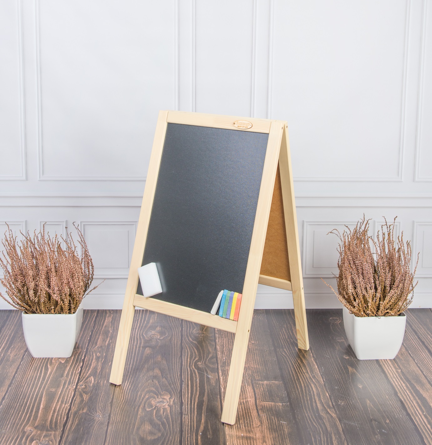 Двостороння рекламна вивіска виготовлена з HDF плити, яка виконує функцію крейдяної дошки, та дерев'яної рами. Стопор має ланцюжок, який запобігає його розгортанню.