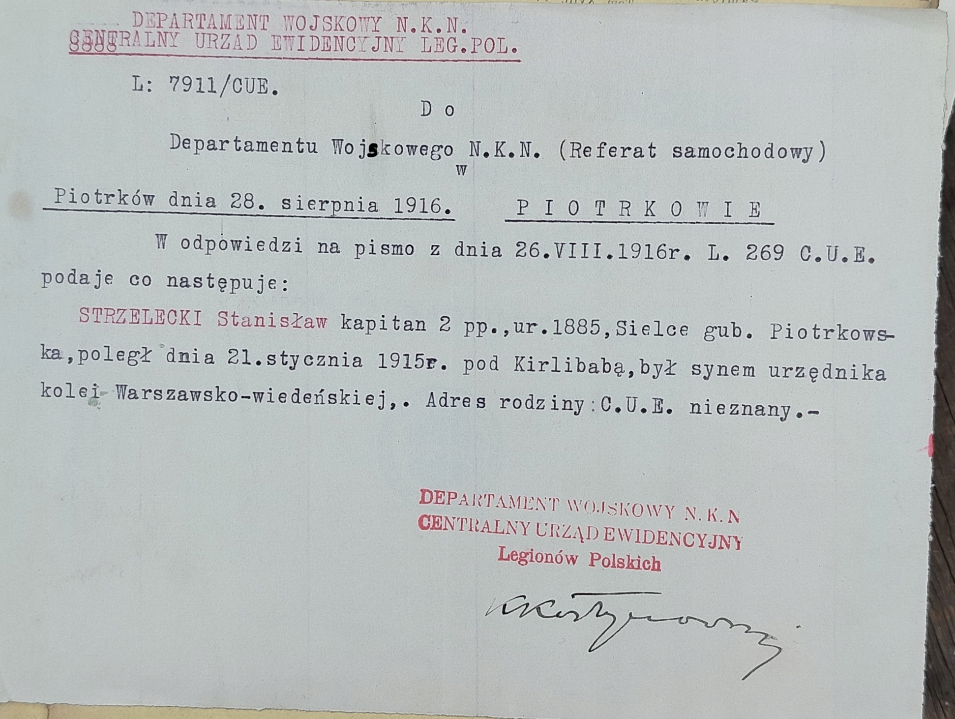 Лист, виданий Військовим відділом N.K.N. Генеральна реєстраційна служба польських легіонів. Відправлений до Військового відділу НКН (Автомобільний відділ). Датовано Piotrków 28 серпня 1916 р. Департамент повідомляє, що названий капітан 2-го полку піхоти ім. Загинув 21.01.1915 під Кирлибабами. Під текстом ставиться штамп Департаменту та підпис особи, яка видає документ. Вміст на одній стороні аркуша 21х16 см, хороший стан [ ПОЛЬСЬКІ ЛЕГІОНИ ][ СПИСОК ВТРАТ ][ ПЕРША СВІТОВА ВІЙНА ] 18D.