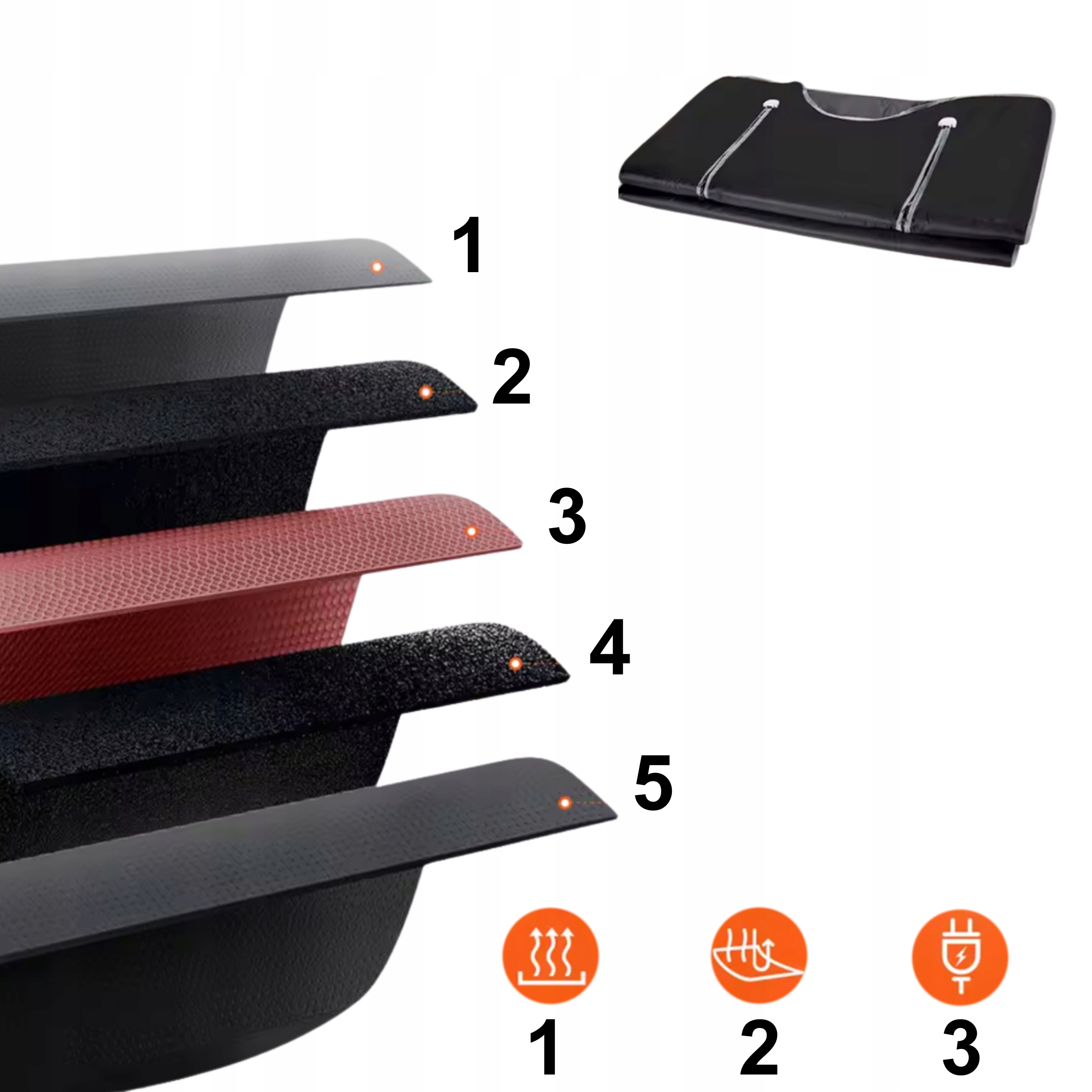 4⃣ м'який та еластичний шар - гарантує комфорт використання, адаптації до малюнка та покращення контакту з теплом. Захисні - обмежує нагрівання поверхонь, що торкаються шкіри, захищаючи від перегріву та підвищення безпеки використання.