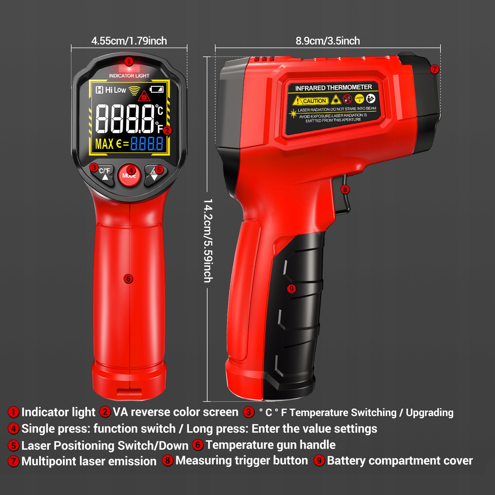 Функція:1. Точні вимірювання: цей інфрачервоний термометр має кілька точок, які точно визначають зону вимірювання, забезпечуючи точні показання щоразу. Співвідношення відстані до точки 12:1 дозволяє безпечно вимірювати малі або віддалені цілі без фізичного контакту.