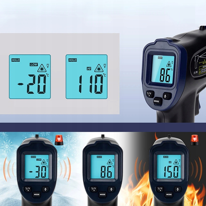 Завдяки діапазону викидів від 0,1 до 1,0 ви можете адаптувати викиди до різних матеріалів. Функція попередження високої/низької температури забезпечує безпеку. Коли температура перевищує поріг встановленого, значок високої/низької на РК -екрані спалахне та транслюватиме звуковий сигнал, попереджаючи при неправильній температурі.