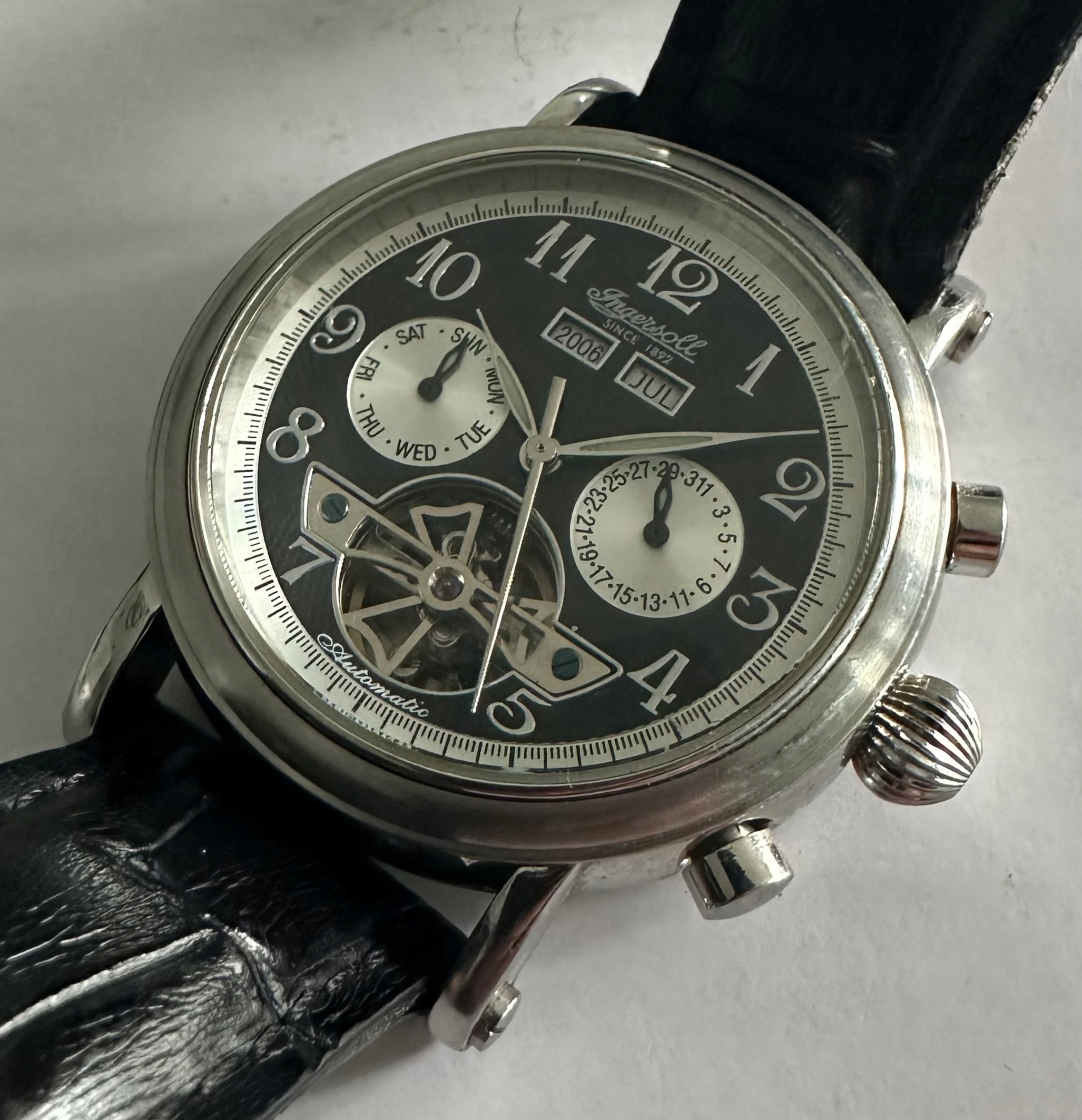 Білий механізм високого класу з автоматичним напруженням з функцією датера та зупинкою з секундою в дуже приємному оригінальному стані, підписаному: Ingersoll з 1892 року 29 Jewels Automatic.