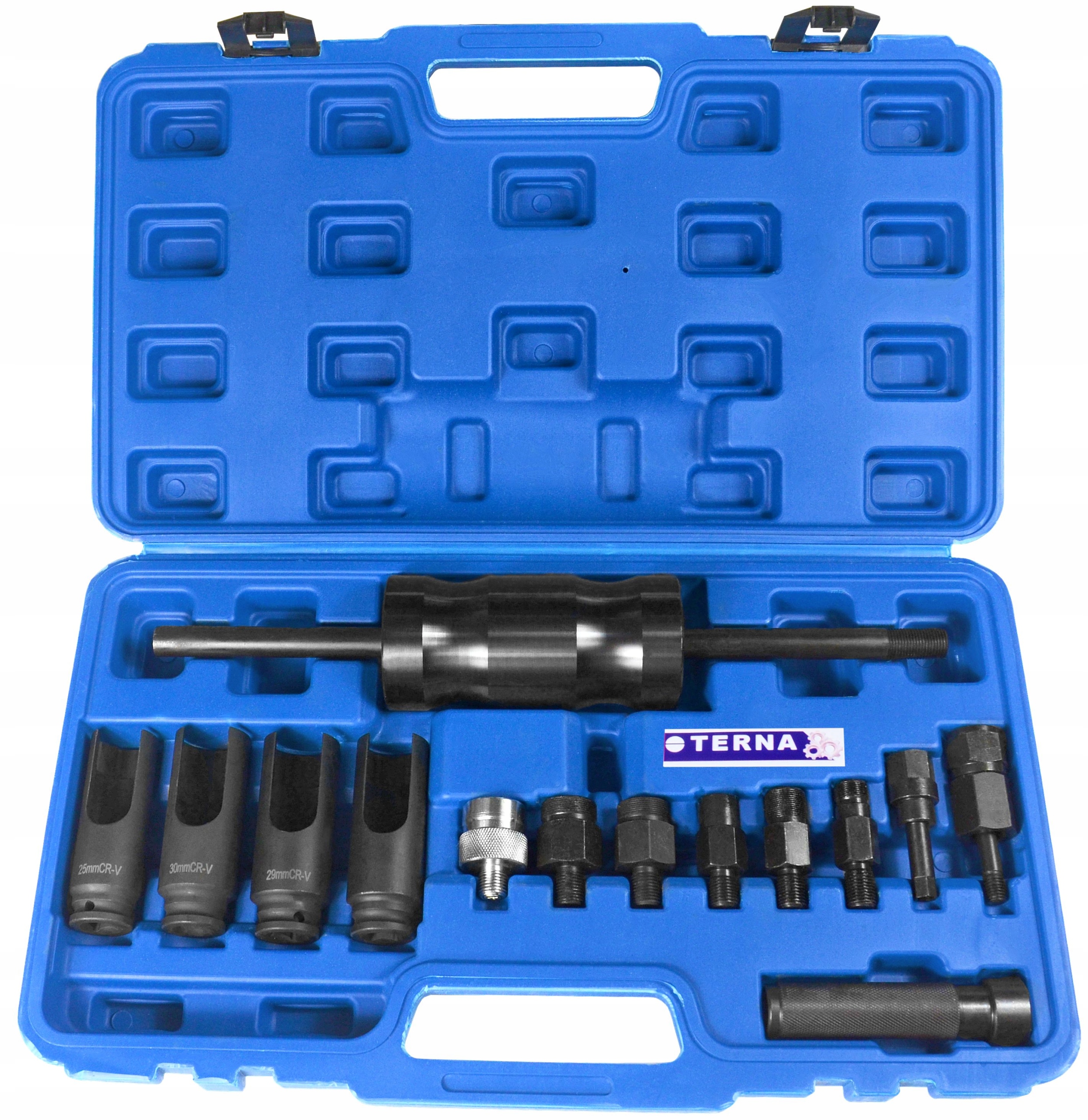 Дозволяє легко та швидко зняти застряглі форсунки з головки блоку циліндрів. У набір входять необхідні ключі, які використовуються з адаптерами.