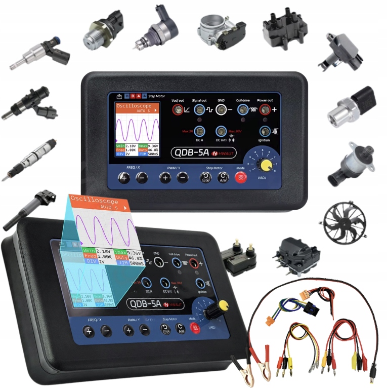 Зручний інтерфейс і елементи керування: Кольоровий TFT-екран відображає форми сигналу та показання; містить ручку перемикання режимів, регульовану вихідну потужність (до 2,5 А) і кнопки регулювання частоти/навантаження; живиться від 9-26 В постійного струму для систем автомобіля 12 В/24 В.