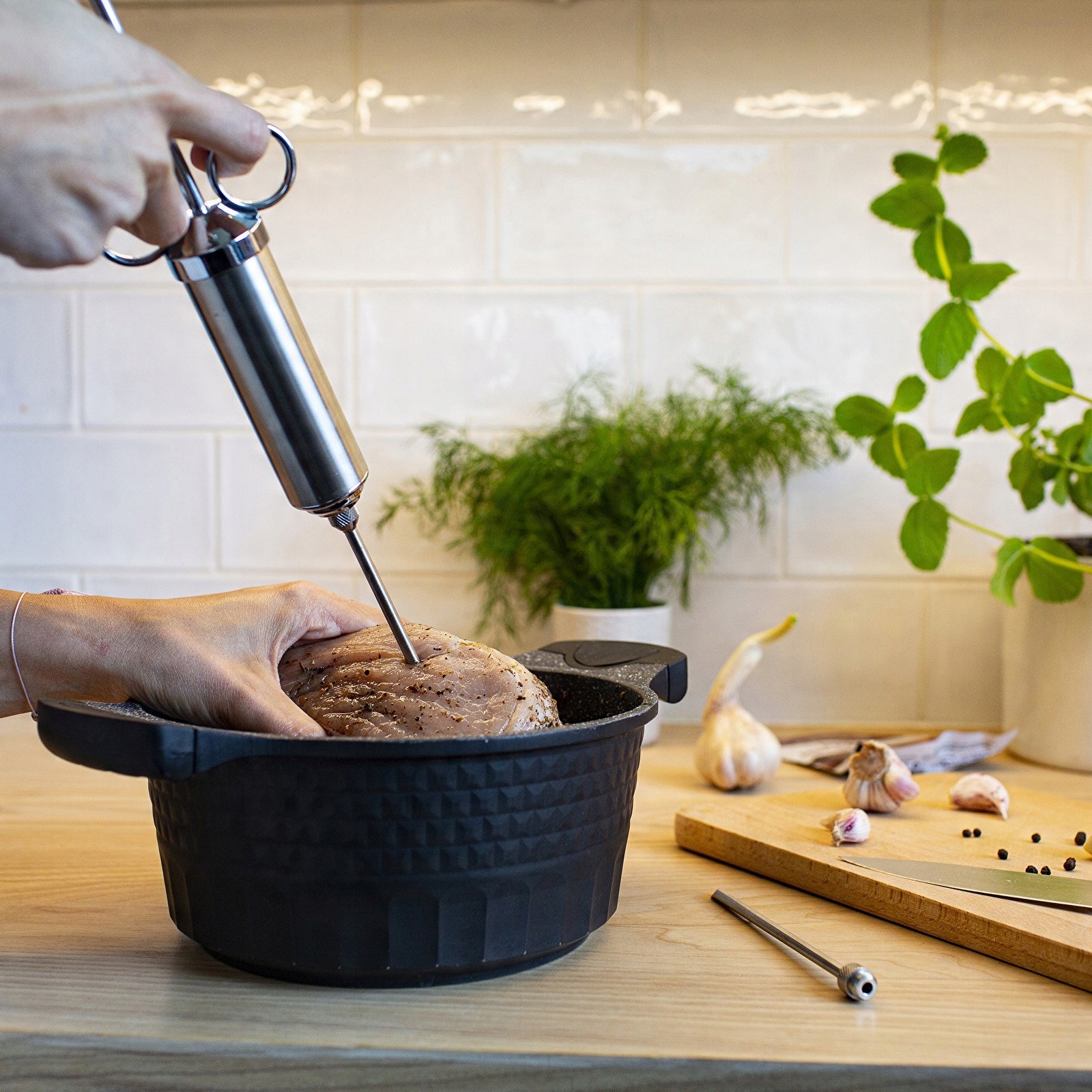 Якщо ви мрієте про соковиту, ароматну та смачну нарізку, вибирайте інжектор із двома голками для сушіння м’яса. Один з них дозволить застосовувати маринад з великими шматочками спецій. По-друге, завдяки своїй характерній структурі з багатьма отворами на різній висоті він забезпечить рівномірне вприскування всього м’яса!
