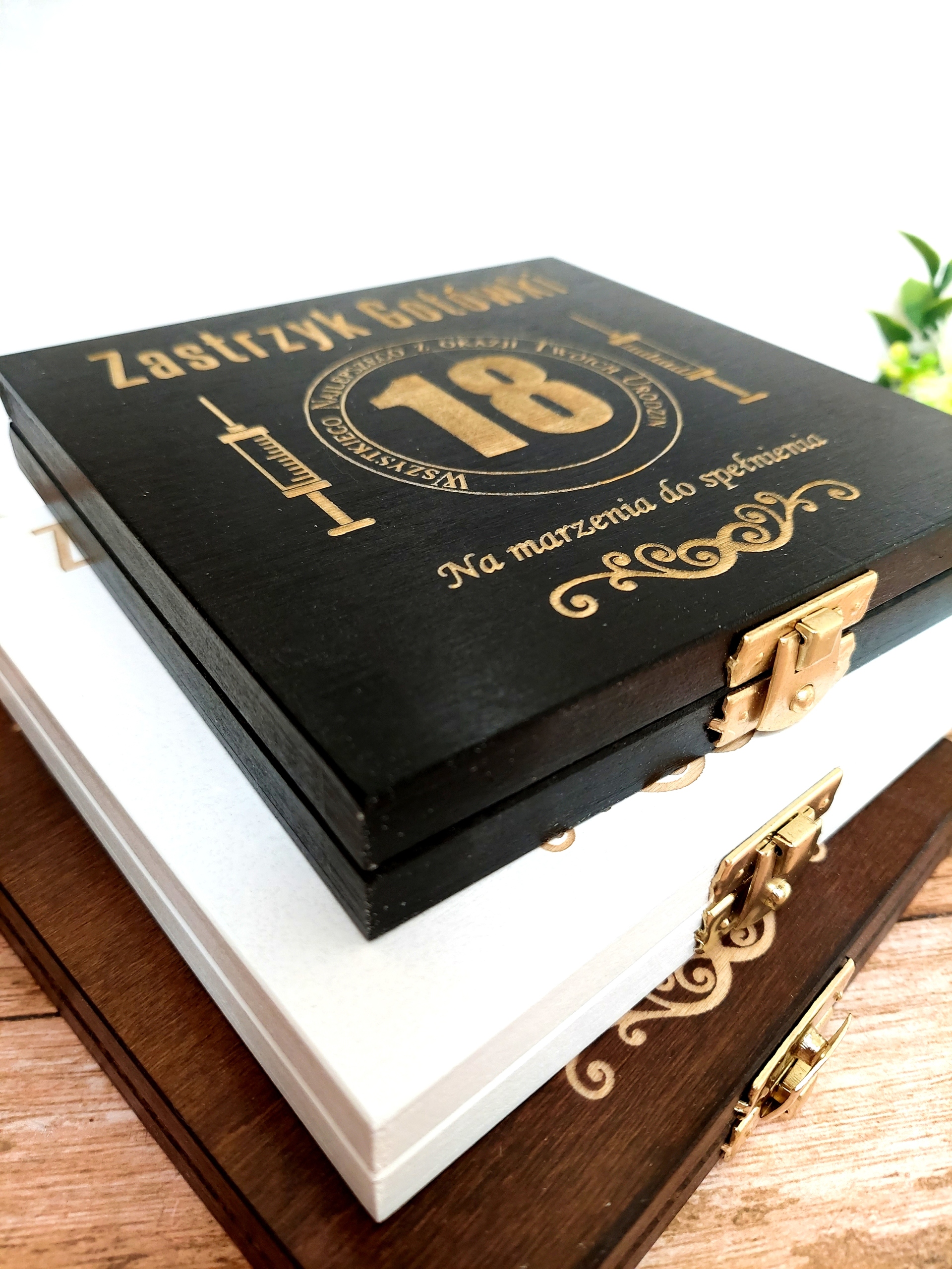 Дерев'яна соснова коробка з 5 шприцами в які згортаємо і кладемо певну кількість. Ідеальний подарунок імениннику на 18-річчя