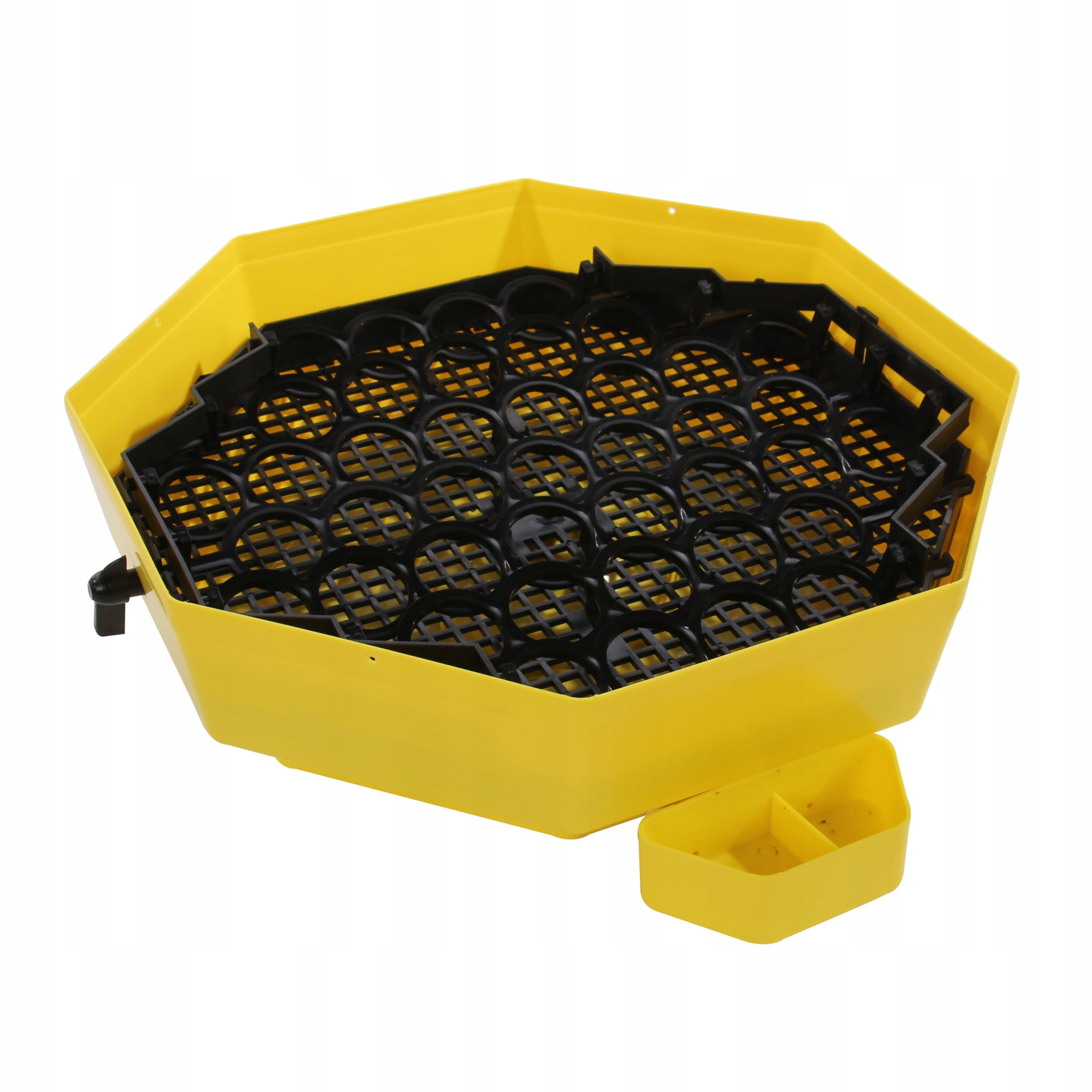 Для кладки яєць використовується основа з гніздовою сіткою, в цьому випадку яйця перевертаються вручну. Є можливість придбати напівавтоматичний лоток для курячих або перепелиних яєць, в цьому випадку обертання яєць здійснюється одним рухом руки - поворотом ключа, що входить в комплект. У нижній частині є водяні канали (фото № 5), завдяки яким ми можемо вручну підтримувати відповідну вологість інкубації, вручну додаючи в них воду. Температура встановлена на заводі 37,8oC.