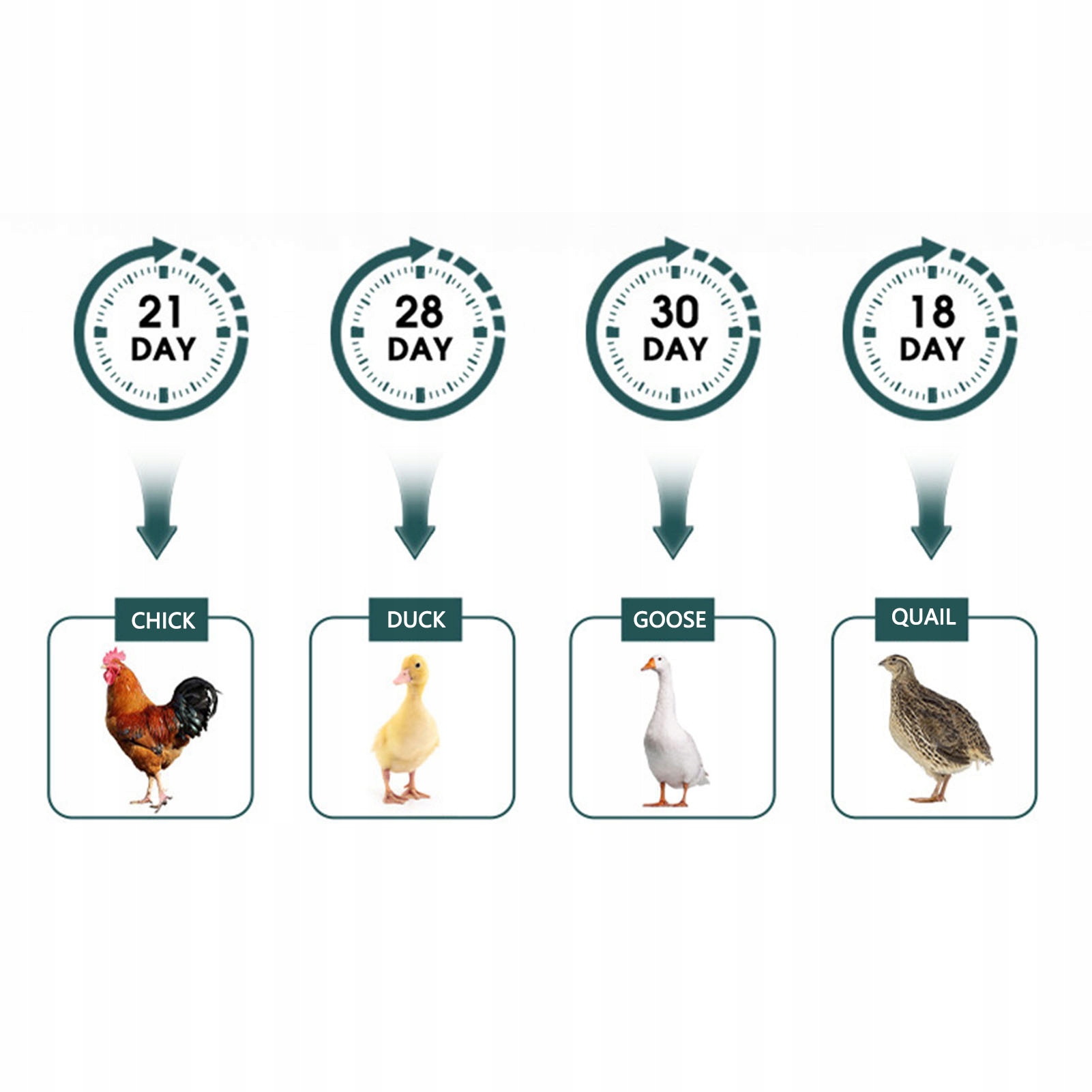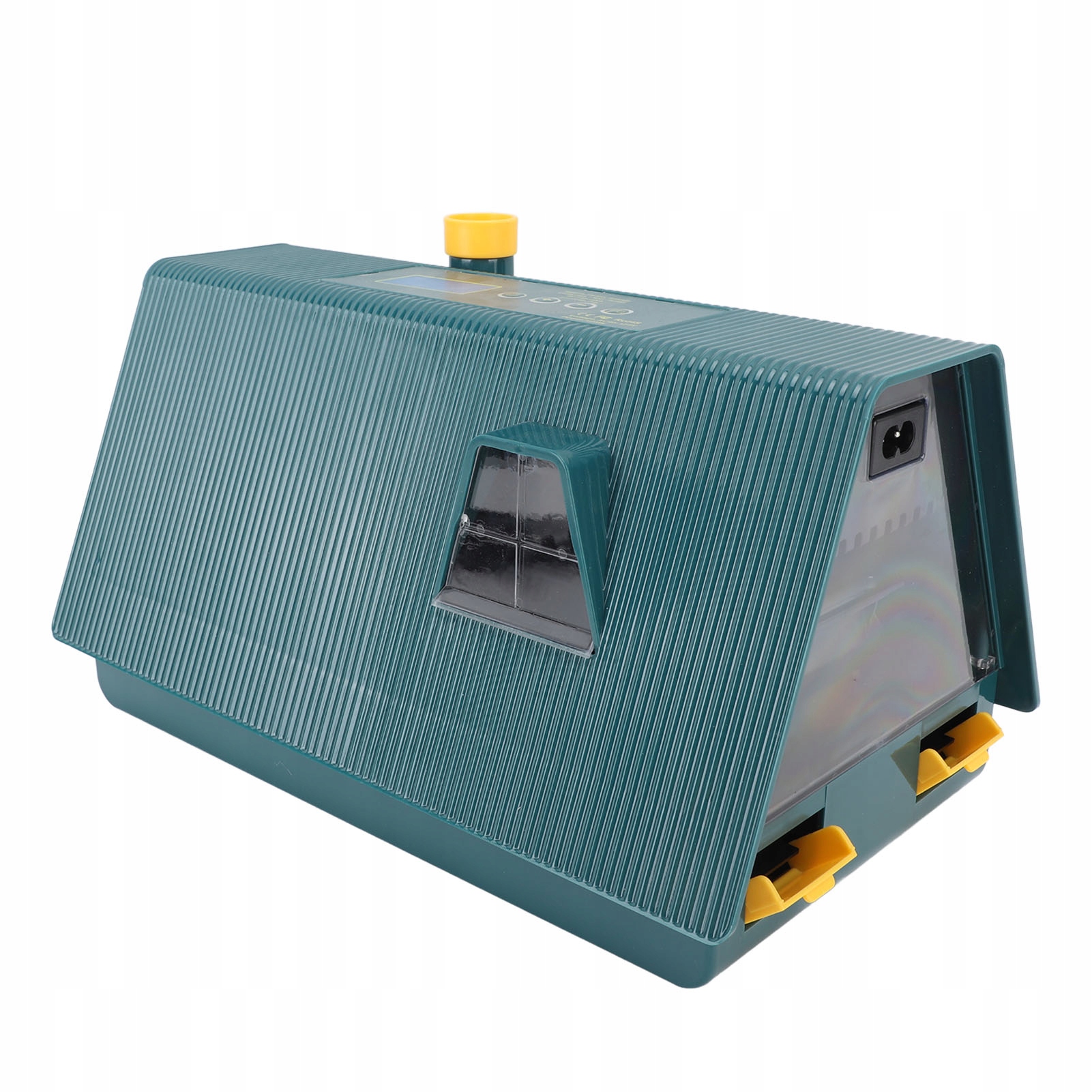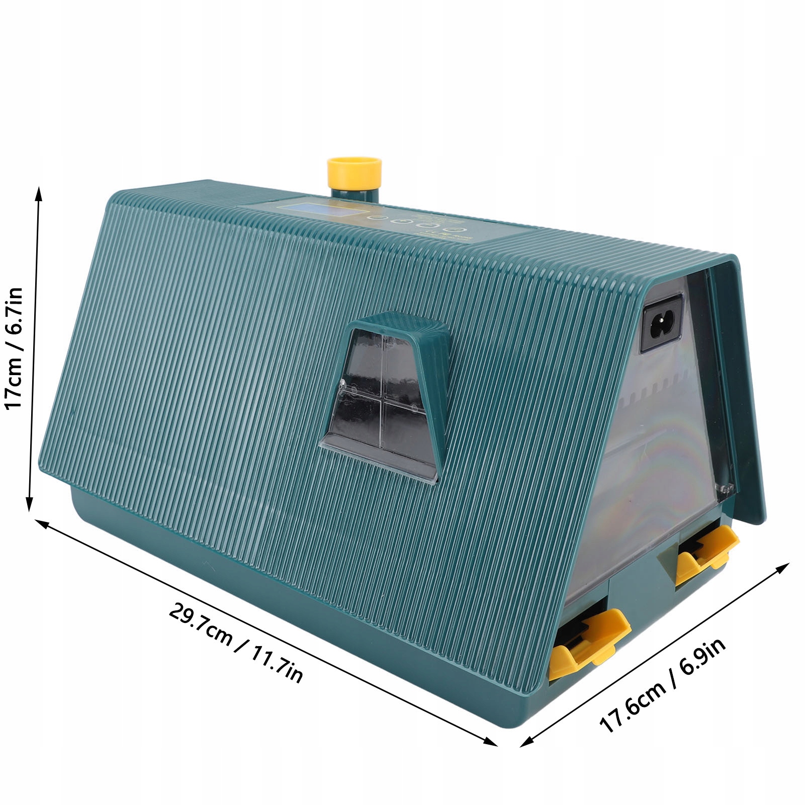 - Функція: керування однією клавішею, подвійний дисплей температури та вологості, автоматичне перевертання яєць, відображення днів інкубації, зворотний відлік перевертання яєць, функція підсвічування яєць, вбудоване освітлення, регульований лоток для яєць, дизайн вентиляції.