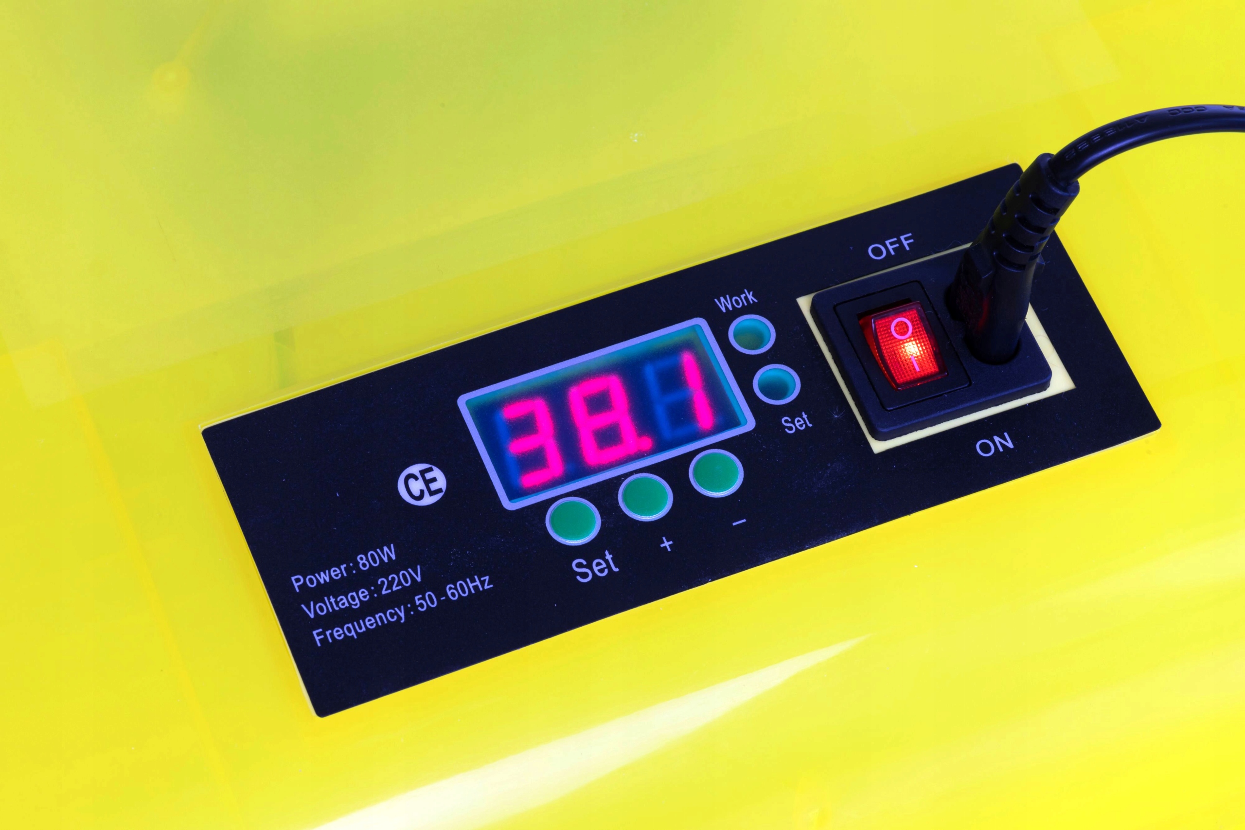 Інкубатор оснащений економічним та дуже ефективним обігрівачем двигуна 80 Вт. Це дозволяє досягти температури від 20 до 50 ° С, тоді як температура вже 40 ° С часто вважається критичною. Постійна температура контролюється надійною системою автоматичного управління.