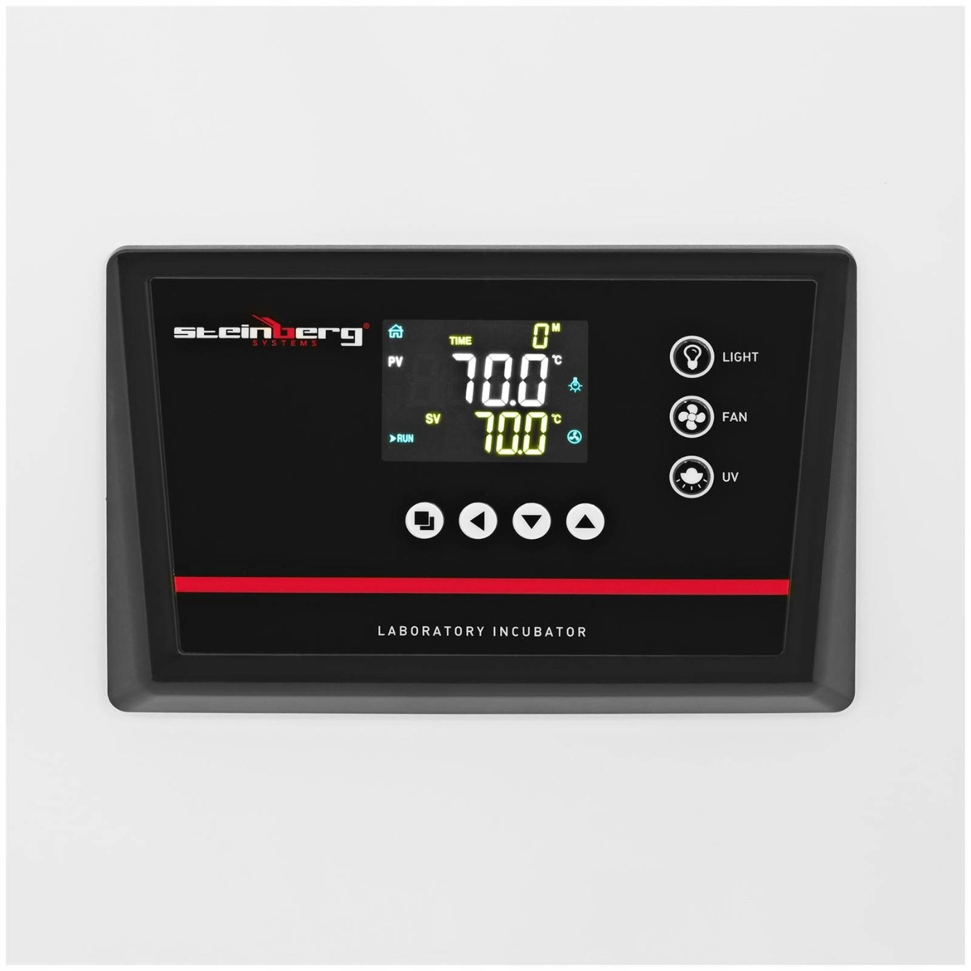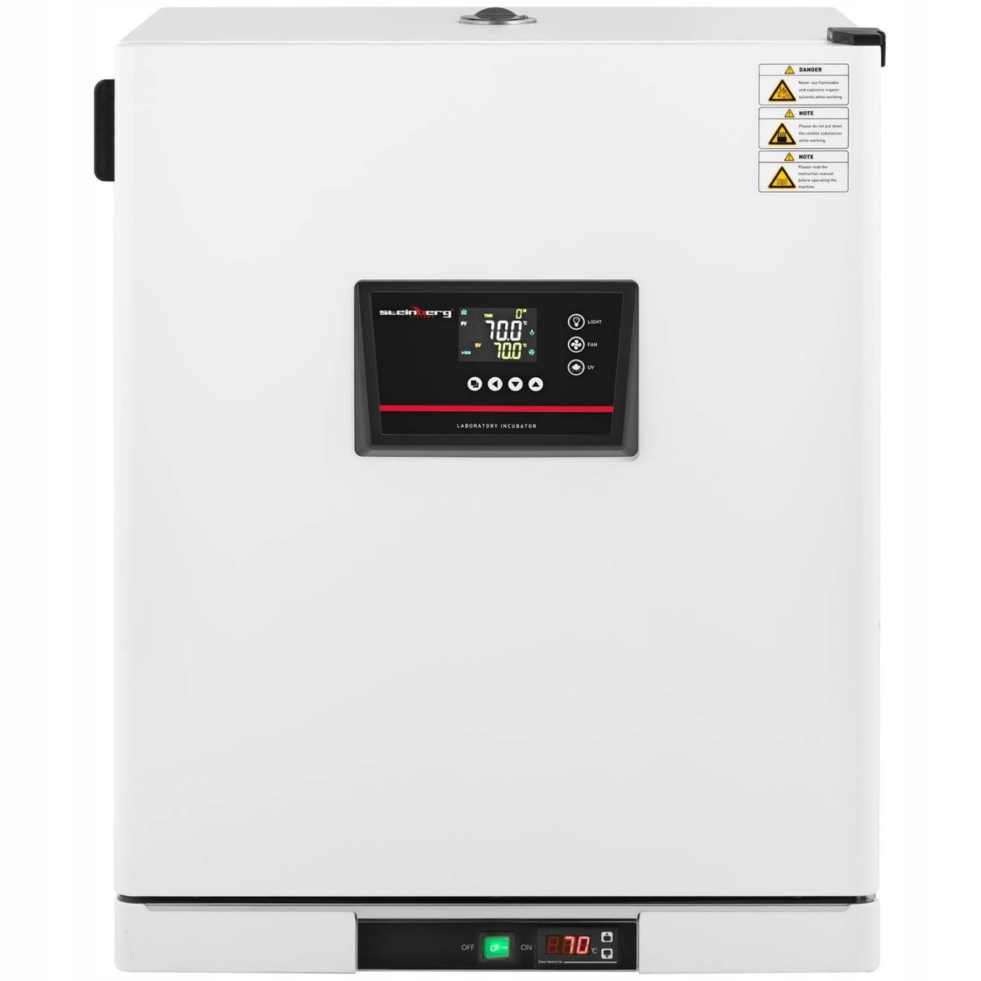 Cieplarka laboratoryjna zapewnia optymalne warunki za pomocą sterowania PID. Można je ustawić na dotykowym panelu sterowniczym i sprawdzić na wyświetlaczu LCD. Oferuje takie funkcje, jak ustawienie czasu i temperatury, zabezpieczenie przed przegrzaniem, timer i automatyczne wyłączanie. Regulator temperatury precyzyjnie utrzymuje ustawioną temperaturę w zakresie od 5 do 70°C w ustawionym czasie 0-9999 min. Найнижча температура ніколи не опускається нижче кімнатної. Це постійно перевіряється датчиками та автоматично коригується у разі відхилень. W rezultacie inkubator laboratoryjny utrzymuje temperaturę z dokładnością do ± 1.5°C. Temperatura jest rozprowadzana równomiernie we wnętrzu za pośrednictwem systemu cyrkulacji powietrza, dzięki czemu nie występują wahania temperatury. Temperaturę możesz niezależnie ograniczyć na wyświetlaczu cyfrowym. Ponadto urządzenie ma funkcję sterylizacji przy użyciu światła UV.