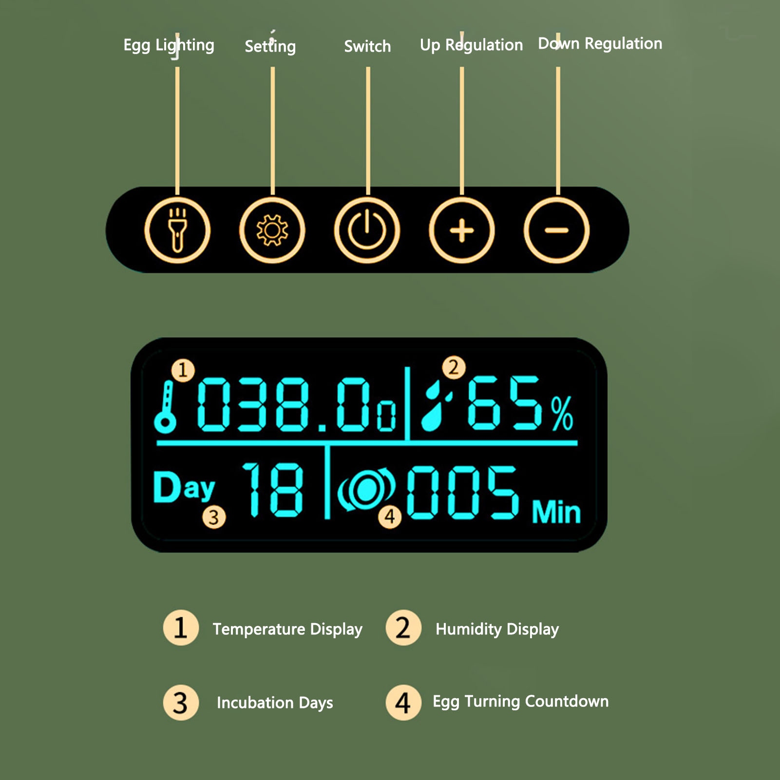 - Функції: керування однією кнопкою, подвійний дисплей температури та вологості, автоматичне перевертання яєць, відображення днів інкубації, зворотний відлік яйця, функція підсвічування яєць, вбудоване освітлення, регульований лоток для яєць, конструкція вентиляційного отвору.