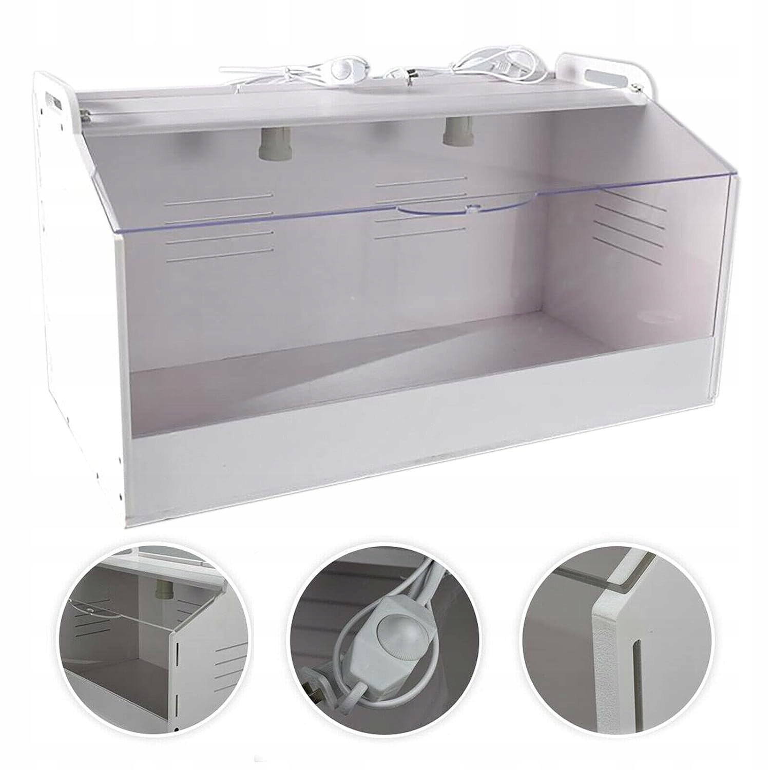 - Інкубатор ПВХ з освітленням для виховання пташенят, рептилій та інших маленьких тварин залежно від типу.