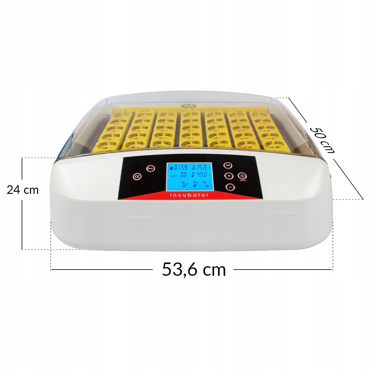 Інкубатор для яєць має цифровий дисплей і панель управління. Чіткий екран дозволяє швидко контролювати такі значення, як температура та вологість. Керувати пристроєм не складно.
