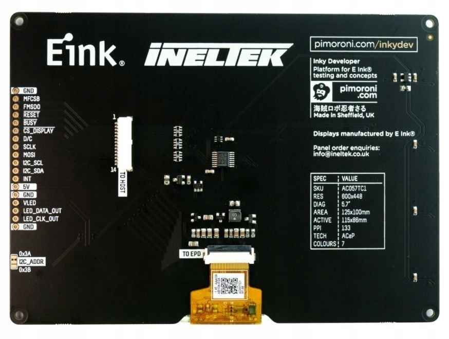 Модуль із 7-кольоровим дисплеєм e-Paper діагоналлю 5.7" і роздільною здатністю 600×448 пікселів. Він підтримує технологію ACeP (Advanced Color ePaper), а вбудований контролер спілкується через інтерфейс SPI. На платі чотири кнопки і чотири світлодіоди APA102 RGB. Дисплеї e-Paper характеризуються високою контрастністю відображуваного зображення та споживають електроенергію лише при зміні відображуваного вмісту. Модуль працює з HAT як частиною модульної системи Inky Developer, яка дозволяє комбінувати материнські плати мікроконтролерів або SBC і різні дисплеї ePaper.