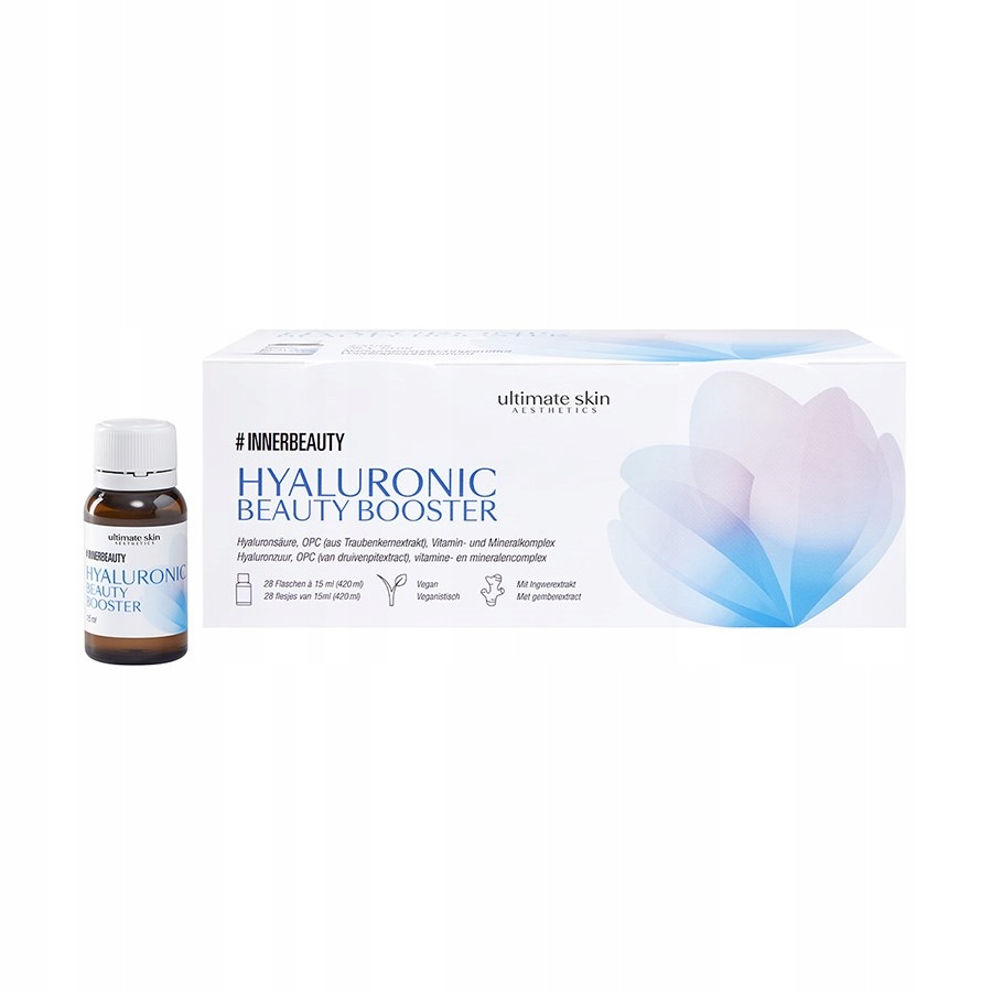 Hyaluronic Beauty Booster від #INNERBEAUTY містить 120 мг високодозованої низькомолекулярної гіалуронової кислоти, OPC (з виноградних кісточок). екстракт) і вітаміни B2, B6, B7, мідь, селен і цинк. Завдяки цим вітамінам і мінералам шкіра, волосся та нігті забезпечуються ефективними поживними речовинами, а сполучна тканина та імунна система підтримуються.