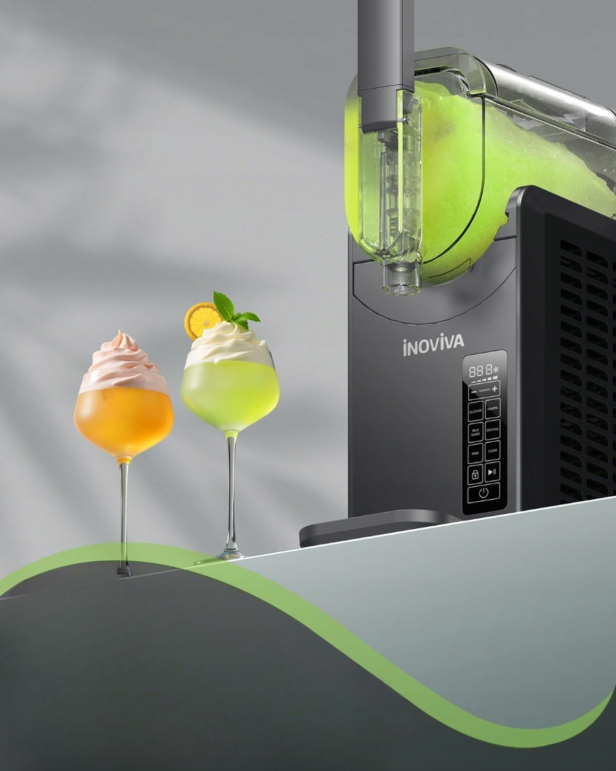 INOVIVA slushie machine усуває клопоти з додаванням кубиків льоду. Все, що вам потрібно зробити, це налити рідину, натиснути кнопку попереднього налаштування типу каші, яку ви хочете приготувати, і зачекати, щоб насолодитися нею. (Зверніть увагу, що вміст цукру в доданій рідині має перевищувати 5%).