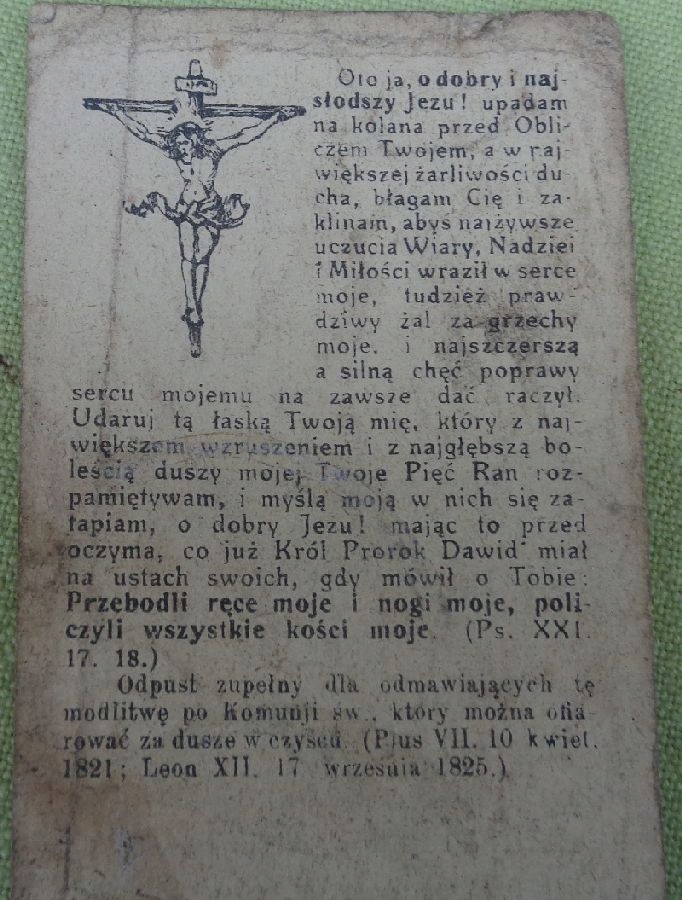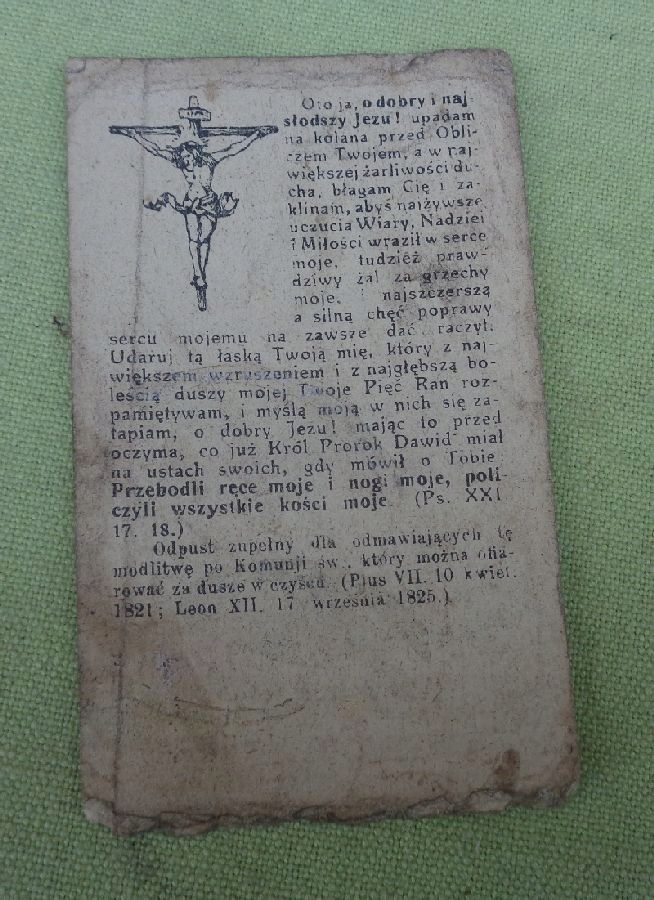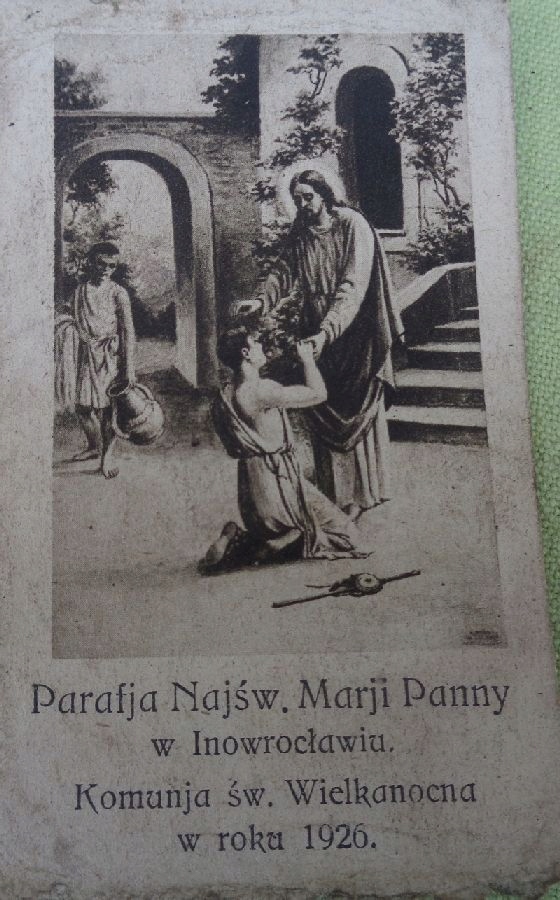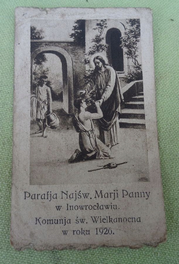 Цікава, цікава, оригінальна листівка, яку роздавала парафія Пресвятої Діви Марії в Іновроцлаві під час Великоднього Причастя 1926 року. На зворотному боці експонату є фрагмент тексту та зображення Ісуса Христа на хресті. На передній частині зображено сцену з життя Ісуса. Стан експонату видно на фото. Рекомендую всім.