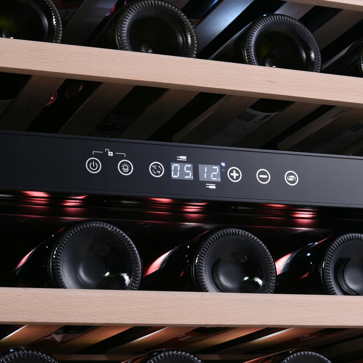 Винна шафа має дві температурні зони (5 - 12°C і 12-20°C), які можна регулювати індивідуально. Це спрощує приготування як ігристого/білого, так і червоного вина до подачі.