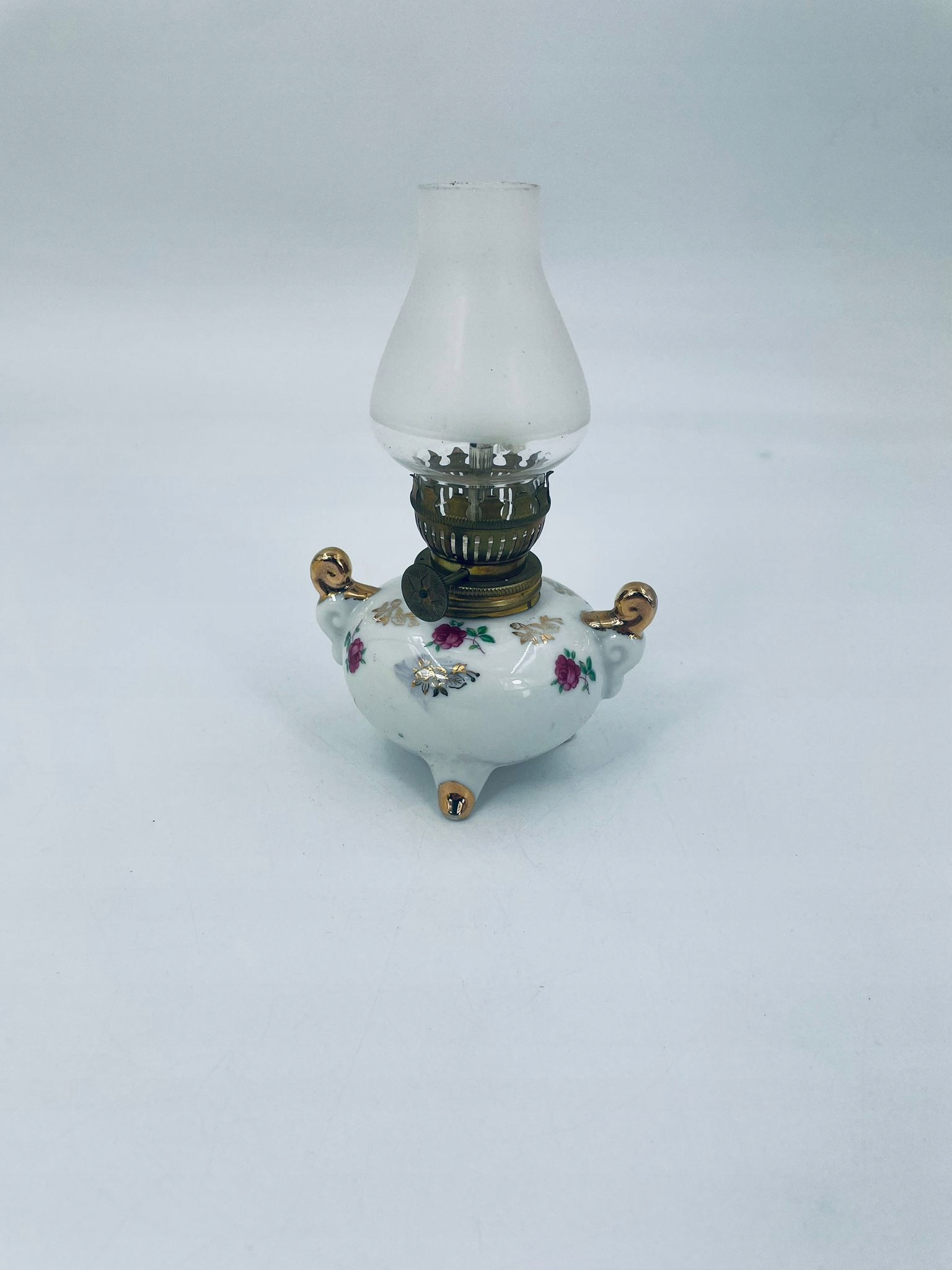 Масляна лампа 1950-х років, виготовлена з білої порцеляни, розписана вручну з мотивом барвистих квітів і золотими акцентами на ручках і ніжках. Камін для лампи, скло матове.
