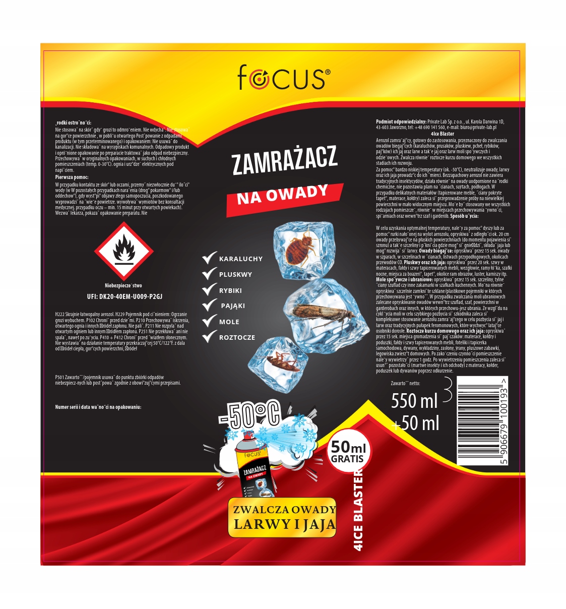 Точне сопло дозволяє наносити аерозоль у важкодоступні місця, такі як щілини в стінах, тріщини на підлозі, плінтусах або просторах за меблями. Завдяки додатковій подовжувальній трубці продукт може досягати найприхованіших куточків, де комахи часто відкладають яйця, ефективно усуваючи проблему в джерелі. Це робить FOCUS Freezer ефективним як для видимих, так і для прихованих середовищ і гнізд комах.