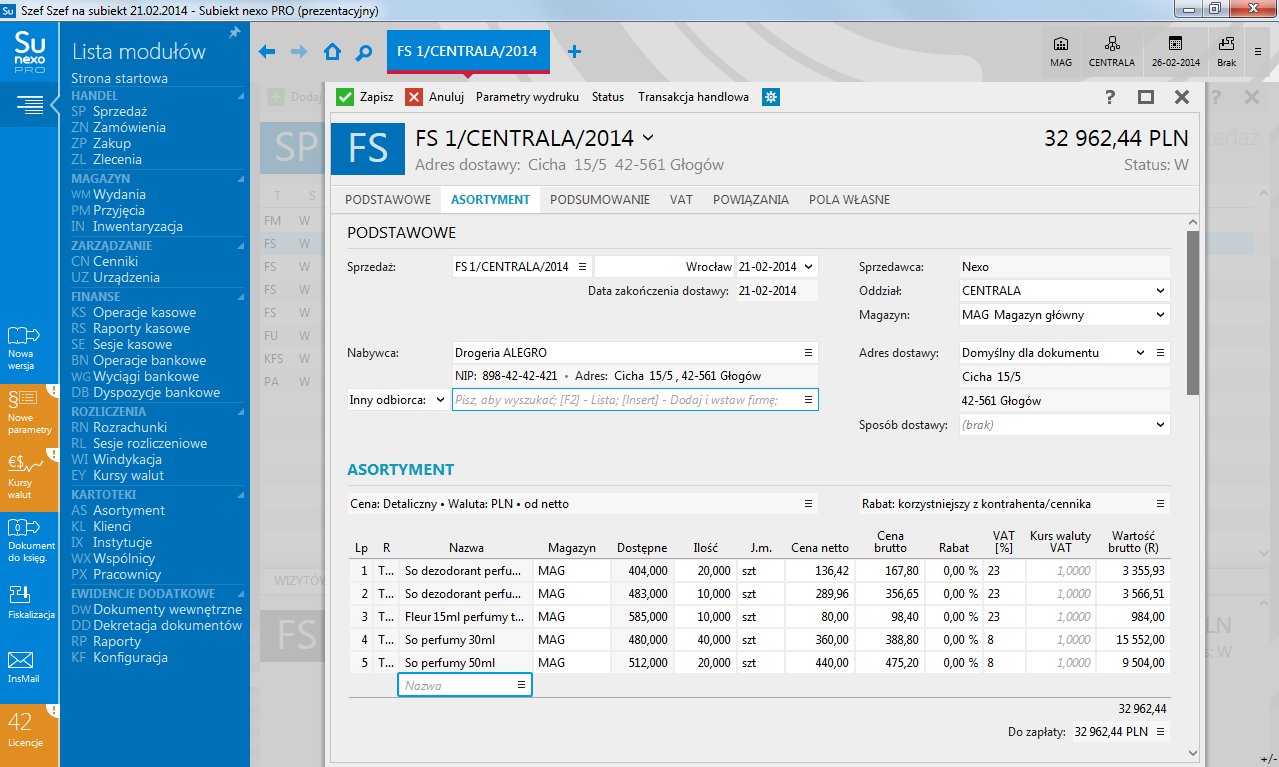 Subiekt nexo PRO дозволяє обслуговувати багатогалузеве підприємство. Дозволяє розширене ціноутворення товарів через основний і додатковий прайс-листи. Він відрізняється широкою обробкою замовлень - серед іншого для версії PRO, робочі перегляди (Асортимент за замовленнями для керування елементами замовлення, Асортимент відсутній, Асортимент за замовленнями), які полегшують логістику замовлень як для клієнтів, так і для постачальників.
