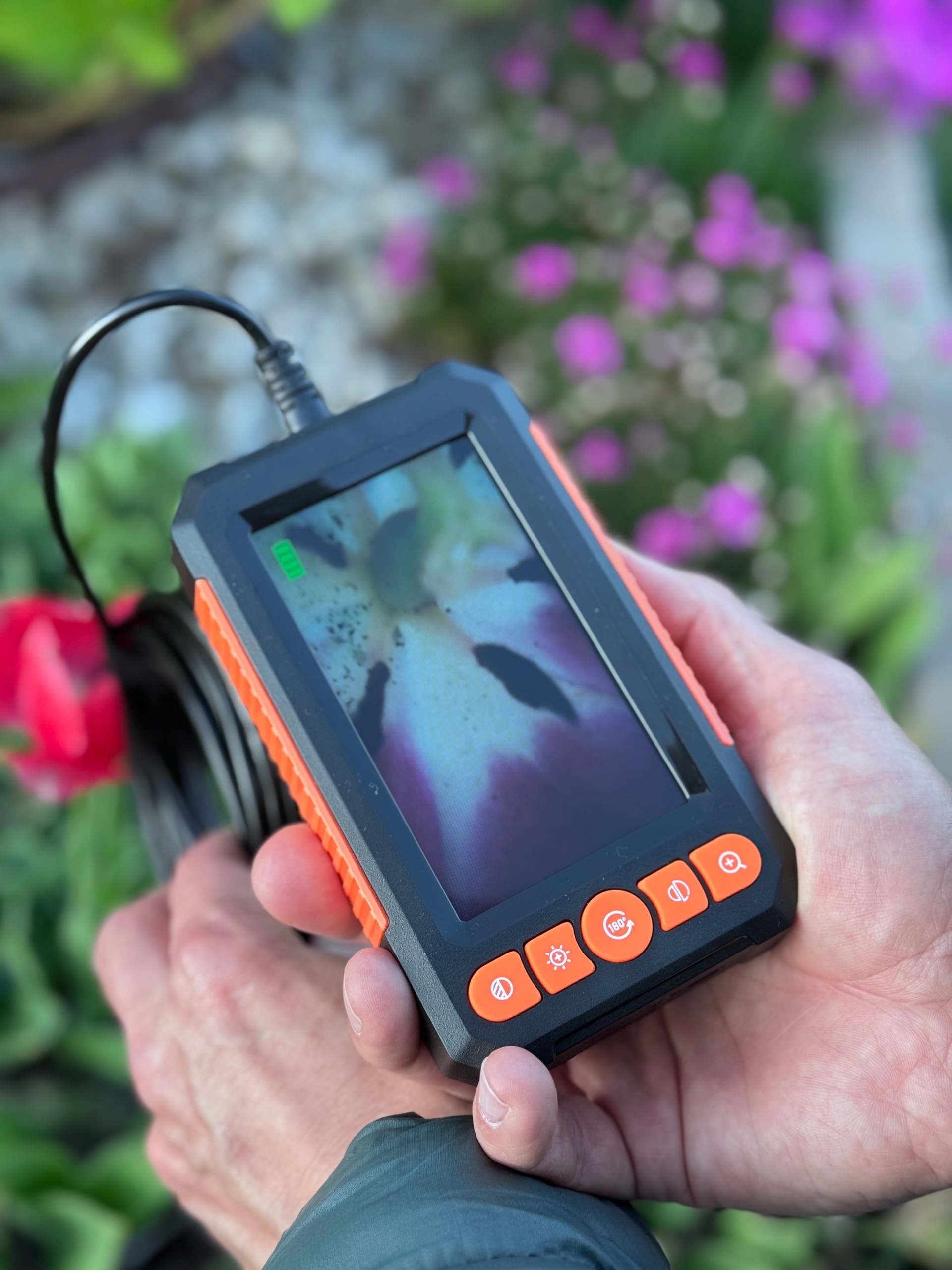 Це професійна інспекційна камера з екраном 4,3 "та подвійною камерою, що дозволяє попереднього перегляду у повному HD -якості 5 метрів!