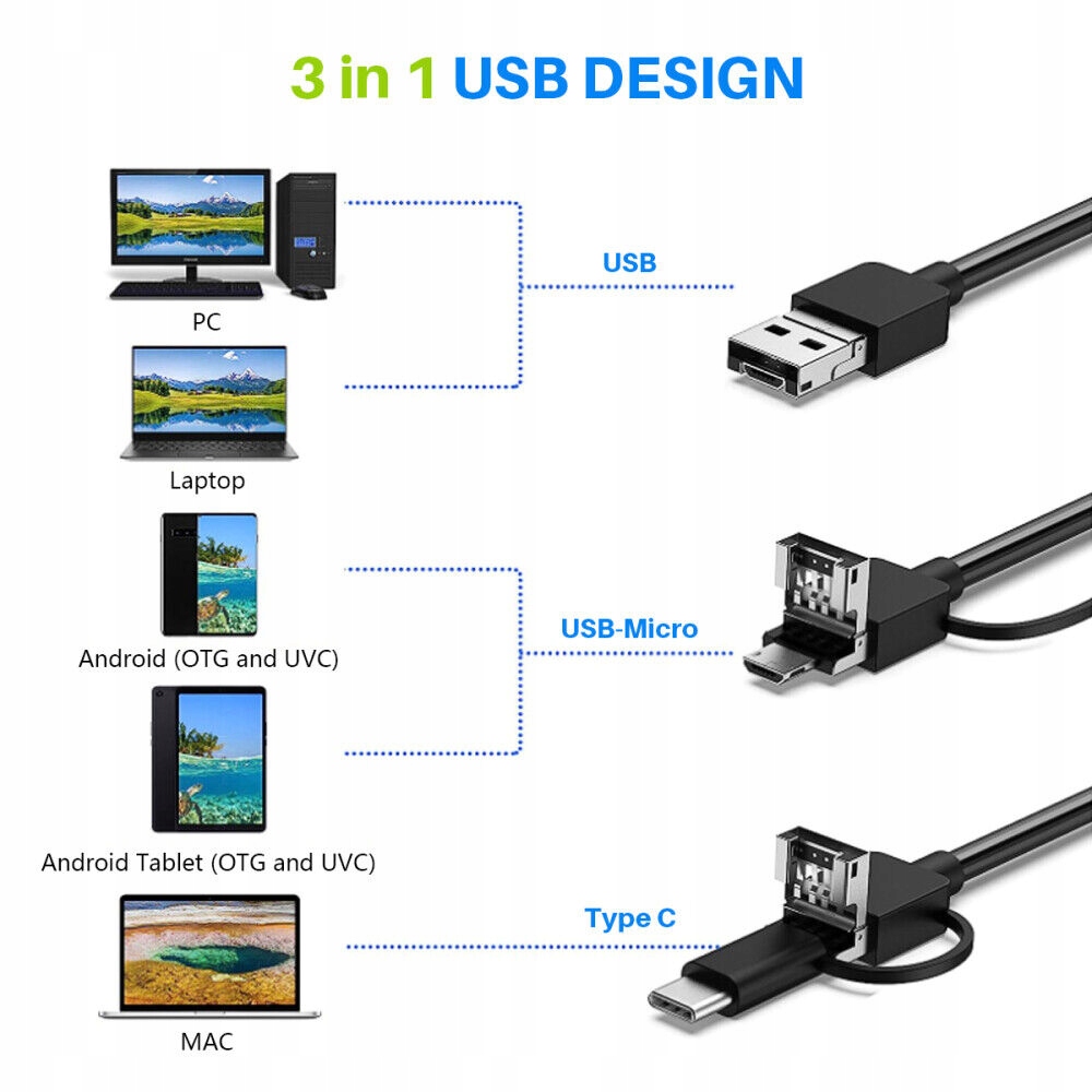 ● Інтерфейс 3 в 1: Ця ендоскопічна камера має інтерфейс USB/Micro USB/Type-C, що забезпечує високу сумісність та широкий спектр програм. Сумісний з пристроями з Windows, Mac OS та Android 9.0 та новішими. Він не підтримує iPhone, iPad та Windows Phone!