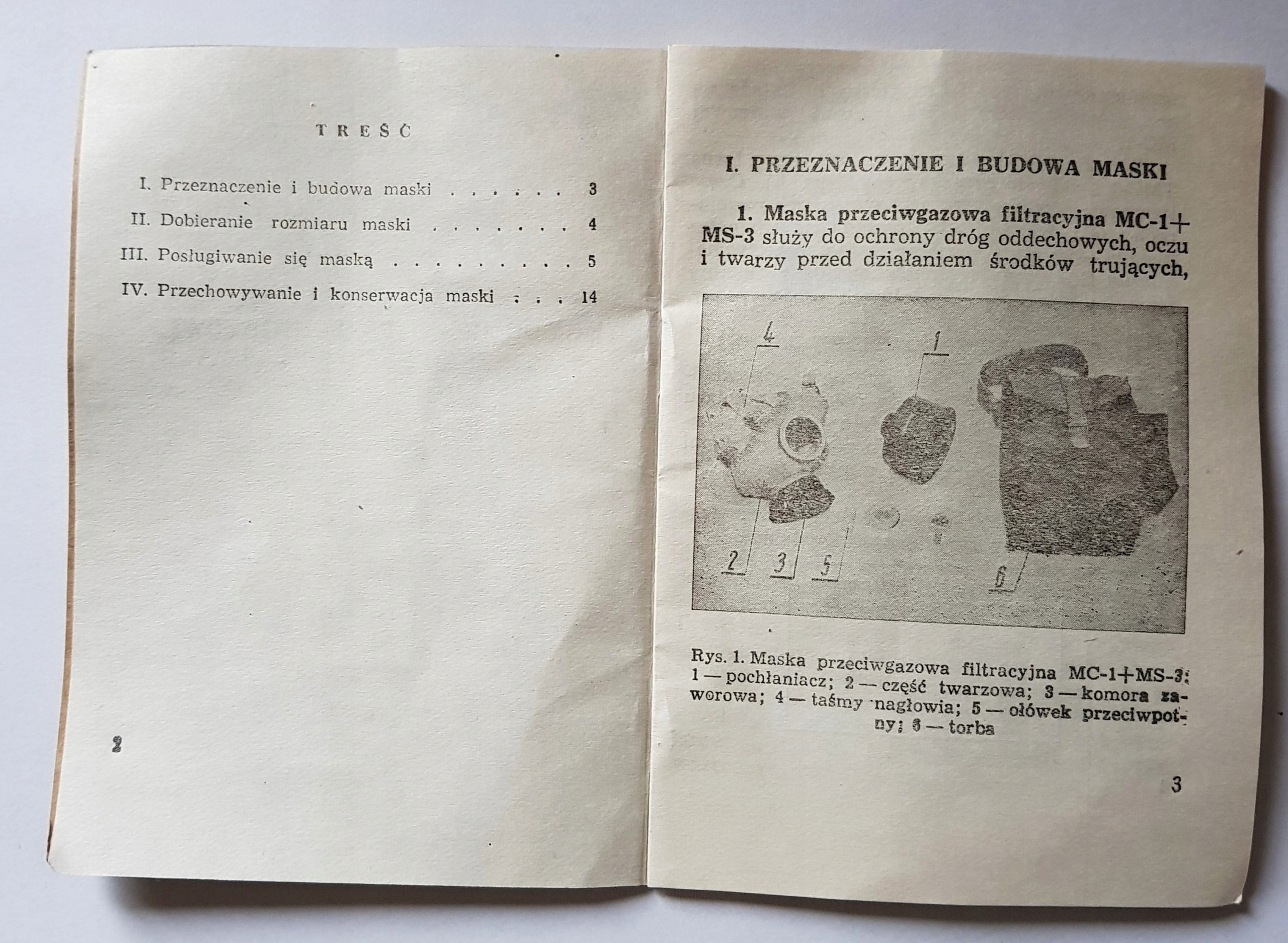 Оригінальна інструкція до протигаза фільтруючого типу MC-1+MS-3 у вигляді буклета на 15 сторінок з описом призначення та конструкцію маски, способи вибору розміру, використання маски та опис зберігання та догляду за маскою разом із малюнками та чорно-білими фотографіями.