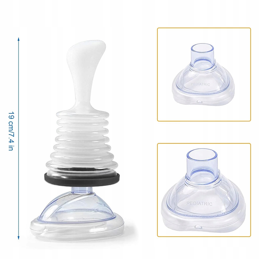 Як використовувати цей рятувальний пристрій у випадку задухи? Покладіть на маску на губи і ніс хворої людини. Натисніть на ручку. Сильна ручка. Це смокче і отримає перешкоду від горла пацієнта.