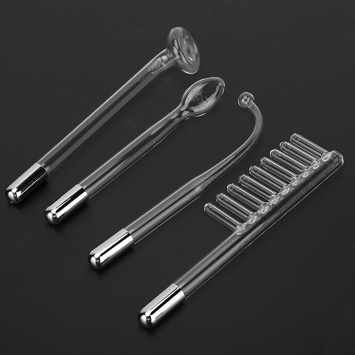 - 🌟 4 різні головки для трубок: оснащені 4 різними головками для електродівдля кращого задоволення ваших потреб; велика грибоподібна головка для великих ділянок обличчя, маленька грибоподібна головка для менших ділянок, маленька скляна головка для точкових ділянок. Гребінець прискорює кровообіг у голові.