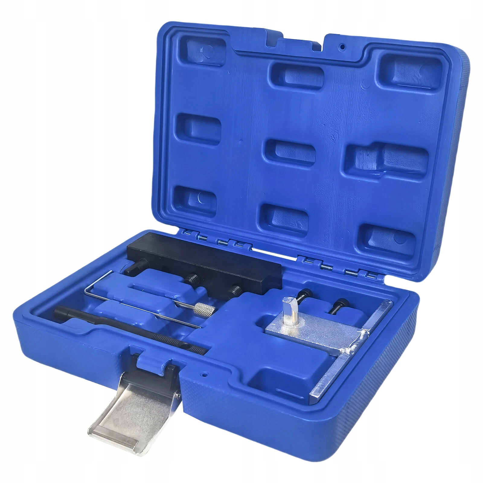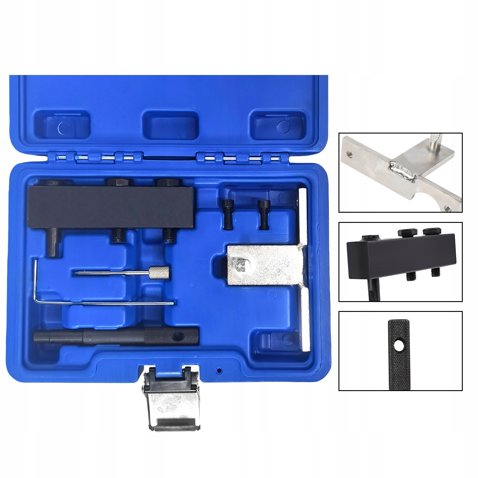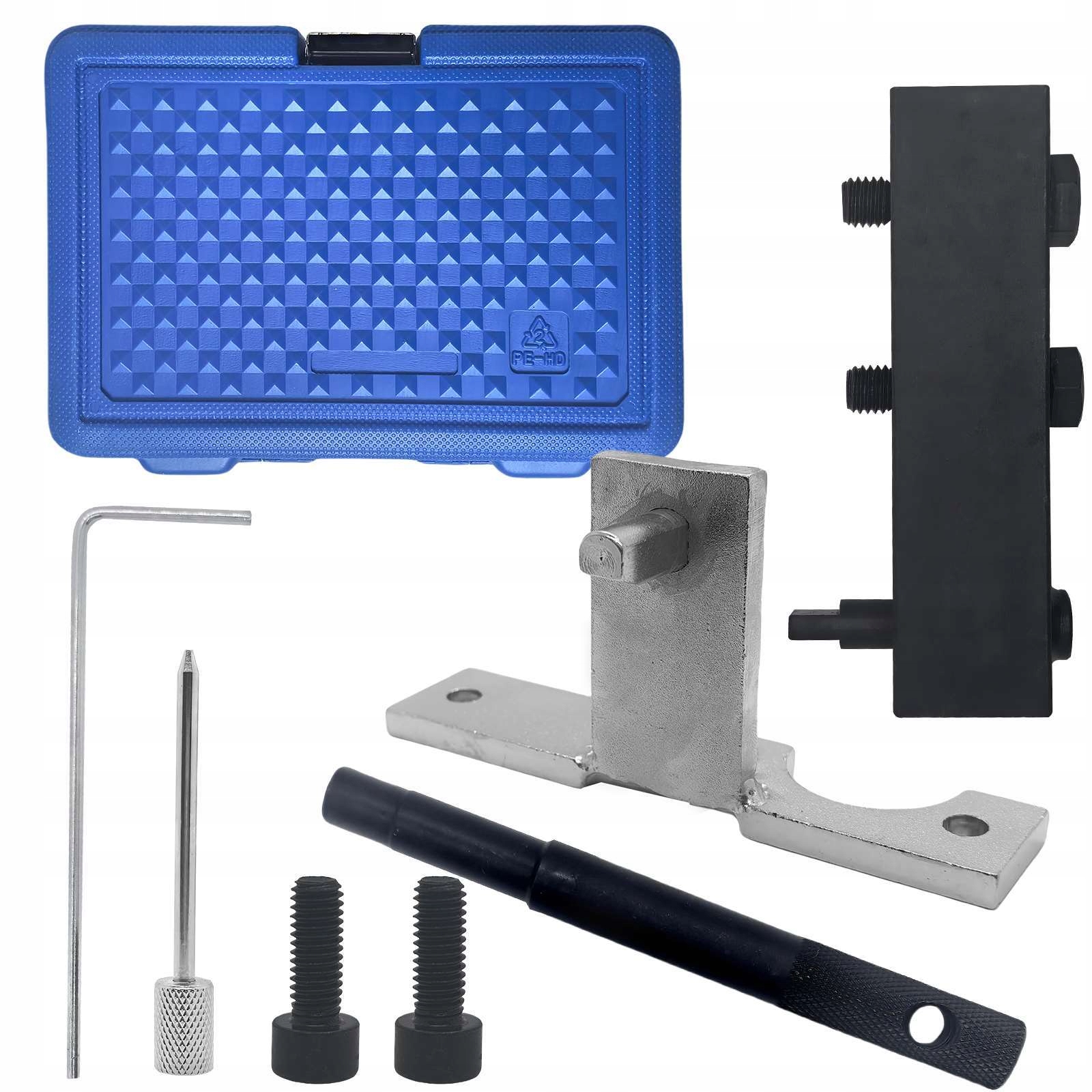 Повний комплект для фіксації 1,6-літрового дизельного двигуна у встановленому положенні, що дозволяє знімати та замінювати ланцюг ГРМ. У комплект входить додаткова опора зірочки розподільного вала, необхідна при демонтажі розподільного вала для виконання необхідних робіт із штовхачами.