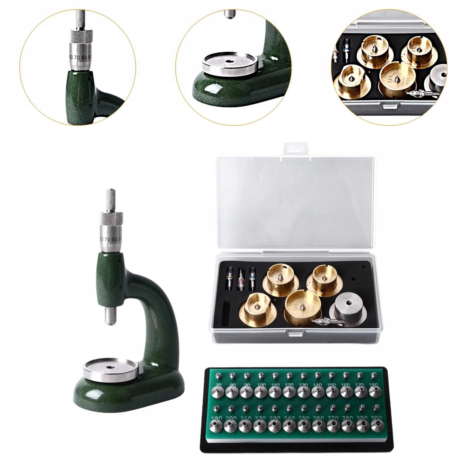 [Компактний розмір]: Виробник має компактні розміри 8 см х 13,5 см х 4,7 см/3,15 дюйма x 5,31 дюйма x 1,85 дюйма, що полегшує зберігати та рухатися. Різні розміри штампів для ювелірних отворів та 1 набір голови на підборах, завдяки якому ви отримаєте всі необхідні інструменти для ремонту годинників.