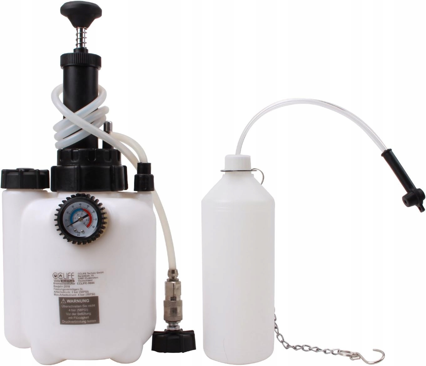 - Вміст комплекту: 3-літровий пристрій для прокачки гальм, 1-літровий зливний контейнер, гайковий ключ і посібник користувача