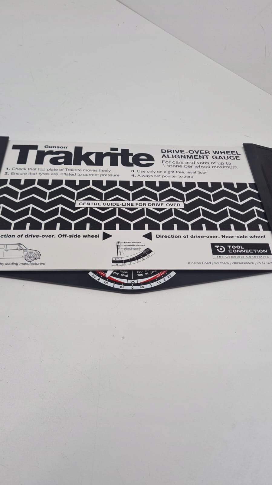 Gunson G4008 Trakrite -це простий -для використання пристрою, який дозволяє швидко оцінити конвергенцію колеса автомобіля. Він працює на основі платформи з котячими підшипниками , після чого одне з передніх коліс транспортного засобу повільно проходить, тримаючи кермо у прямому положенні. У разі неправильної конвергенції верхня пластина рухається збоку, а індикатор демонструє напрямок та ступінь відхилення . Завдяки цьому ви можете швидко визначити необхідність "регулювання геометрії підвіски.