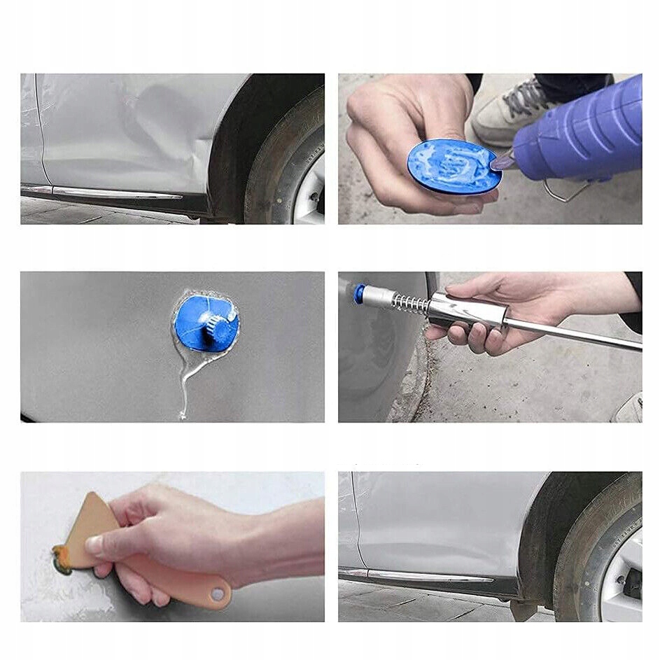 🚗 Універсальність:підходить для вм’ятин на автомобілях, ремонту подряпин на дверях, пошкоджень градом та інших вм’ятин. Набір Body Repair Dent Removal Kit забезпечує ефективне видалення вм’ятин від автомобілів, холодильників, пральних машин та інших металевих слідів.