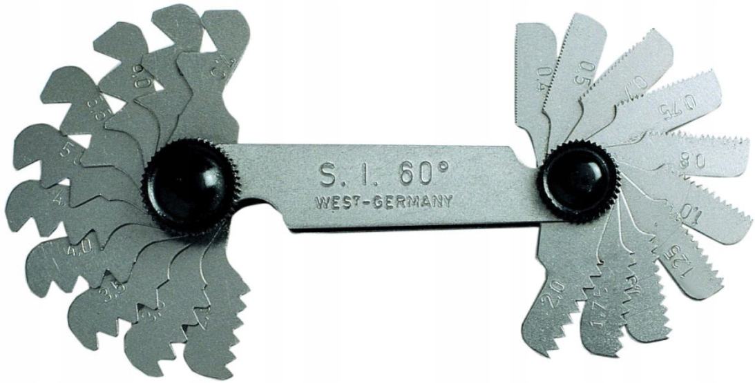 Інструмент містить 48 шаблонів для перевірки більшості кроків різьб, які зустрічаються в мотоциклах.