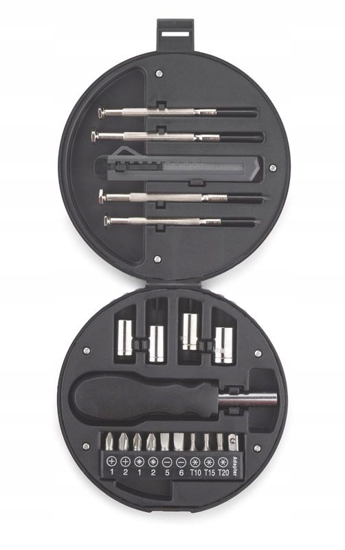 Набір з багатьма корисними інструментами: чотири точні викрутки, нож шпалер, ручка, чотири клавіші кріплення з адаптером та дев'ять біт. Все разом закрито в характерному випадку.