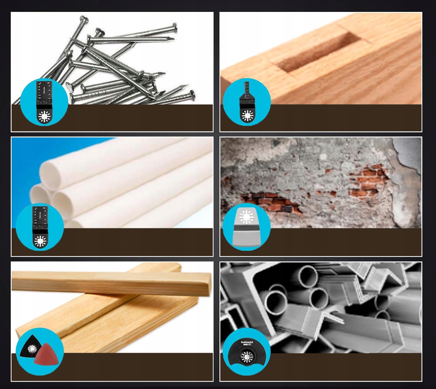 📦 у встановленій 1 дисконій пилці, 3 прямокутних лопатках, 1 трикутній шліфувальній пластині, 2 скребці та трьох різних типів наждачного паперу для задоволення різних потреб.