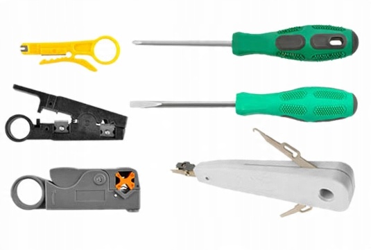 Стріппер дозволяє безпечно знімати ізоляцію з проводів різної товщини. Оснащений фрезою і знімачем. У комплект також входить штовхач для кабелів з роз'ємами LSA; дві викрутки - плоска і хрестова, необхідні при виконанні дрібного ремонту кабелів; два інструменти для різання та ізоляції проводів, без яких не обійдеться жоден професіонал.