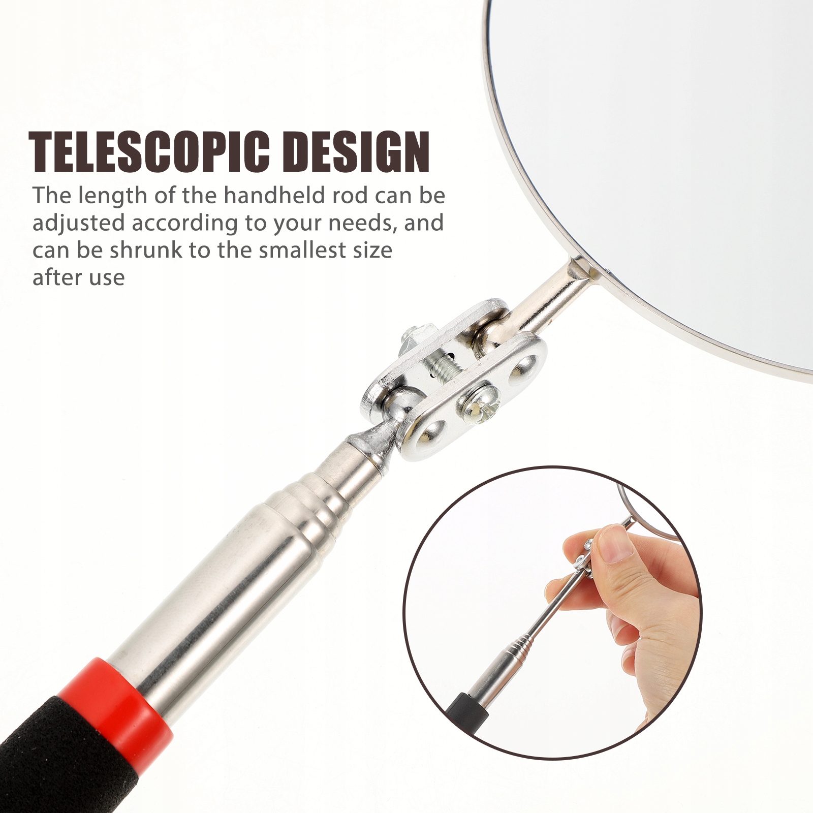 ✅Легко носити: Телескопічне оглядове дзеркало є хорошим інструментом, щоб задовольнити ваші потреби в огляді, за допомогою телескопічної палиці можна регулювати довжину ручної палиці відповідно до ваших потреб, а після використання його можна зменшити до найменшого розміру, який легко переносити та зберігати.