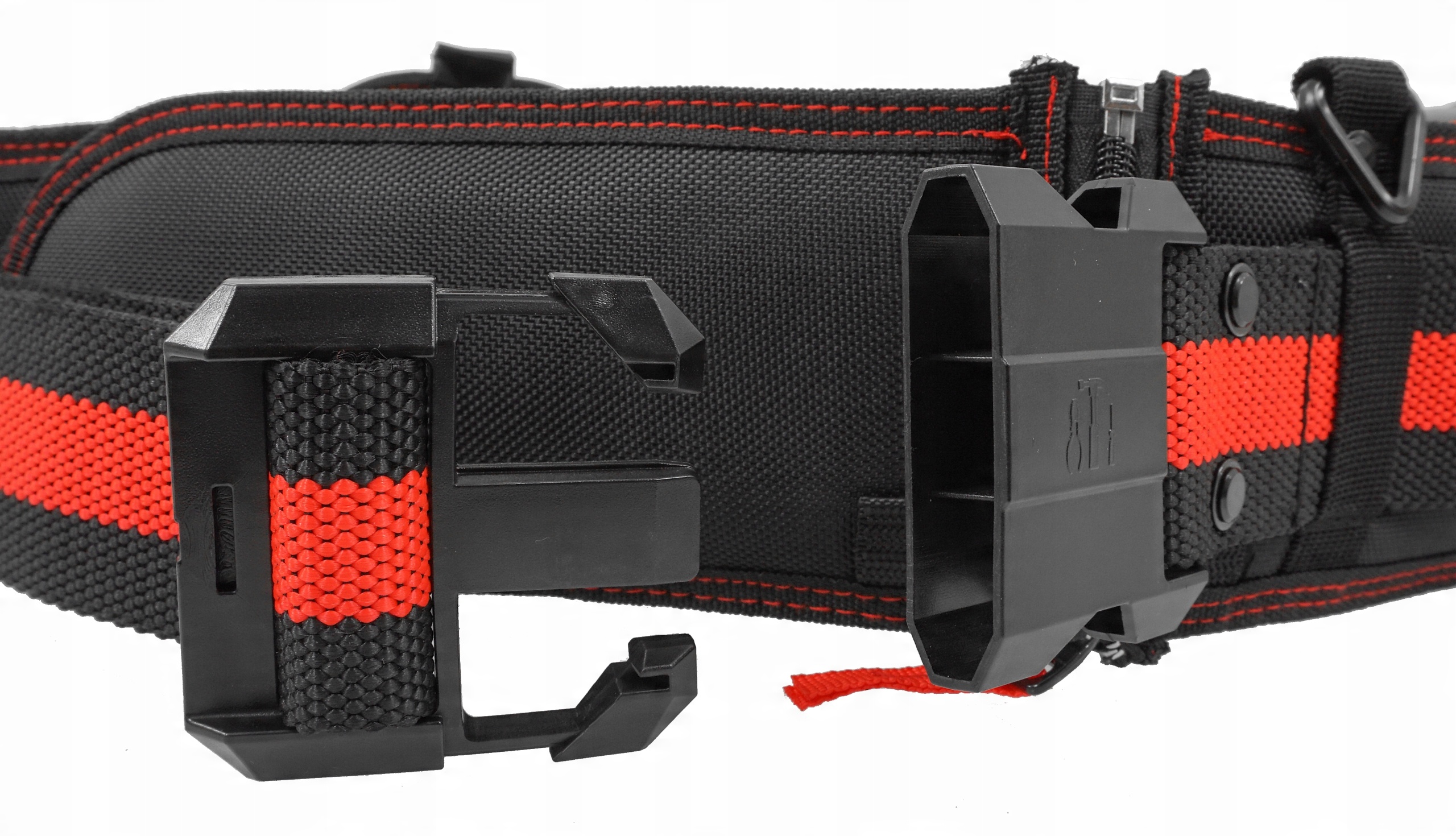 Ремінь для інструментів з двома висувними сумками з численними кишенями та петлею для молотка. Кожна сумка кріпиться до клацаючої ручки. Міцний ергономічний ремінь застібається на липучку, блискавку і додатково застібається на пряжку. Має тримачі для кріплення джгутів. Матеріал: поліестер 1680D. Тканини з переплетеннями 1680D є одними з найбільш міцних і довговічних матеріалів. Щільна граматура забезпечує виробам виняткову міцність і стійкість до різного роду механічних пошкоджень. Тканини характеризуються чіткою структурою плетіння та мають додаткове PU покриття. Такий спосіб просочення зміцнює матеріал і надає тканині властивості захисту від бризок. Для транспортування та зберігання інструментів на робочому місці.