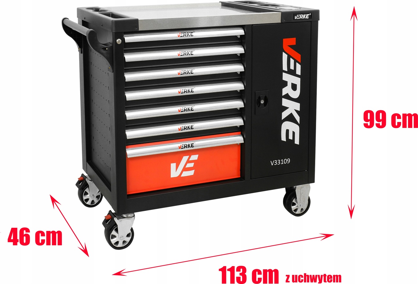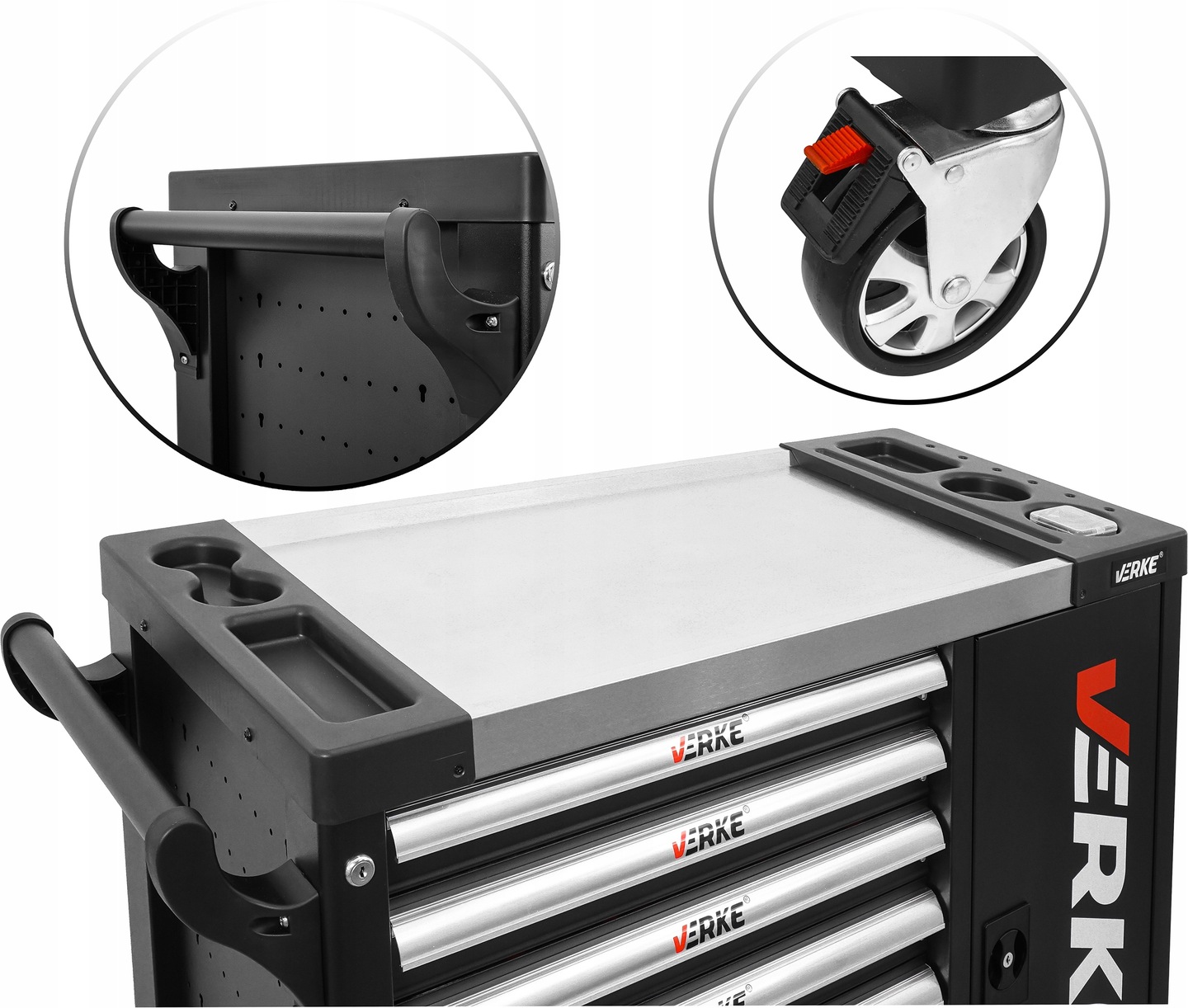 У шафі для інструментів Verke є7 практичних ящики для інструментів, закриваються на центральний замок. Усі висувні ящики повністю відкриваються та мають напрямні на кулькових підшипниках, що забезпечує тривалу, плавну та надійну роботу. Ящики закріплені храповим замком, що забезпечує захист навколишнього середовища під час транспортування. Поверхня стільниці стійка до масла та жиру. П'ятидюймові тихі поворотні колеса полегшують маневрування шафою, а також оснащені гальмом. Шафа оснащена ручкою, що полегшує її перенесення.
