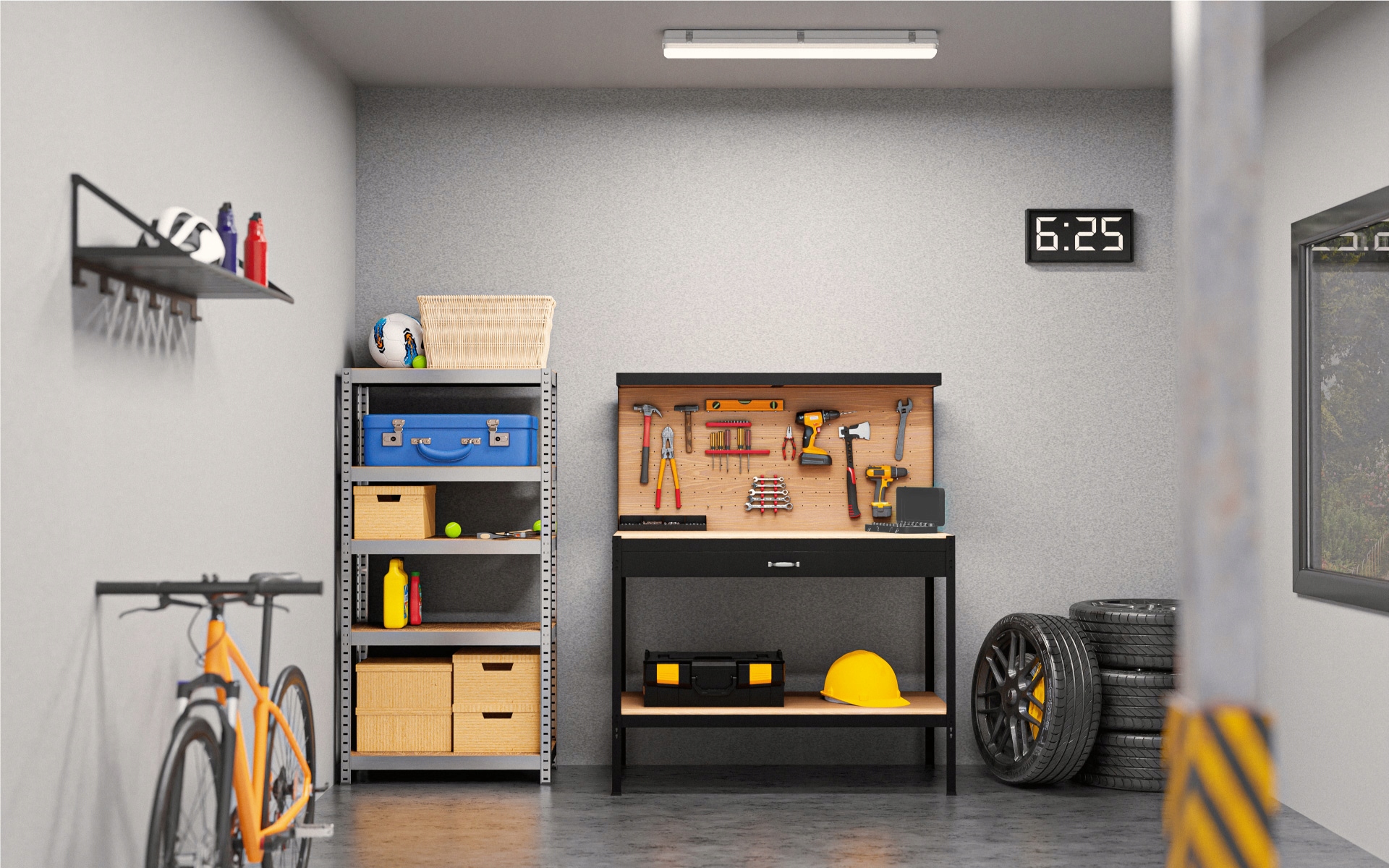 - Робоча поверхня, місце для зберігання та дошка для підвішування інструментів в одному місці.