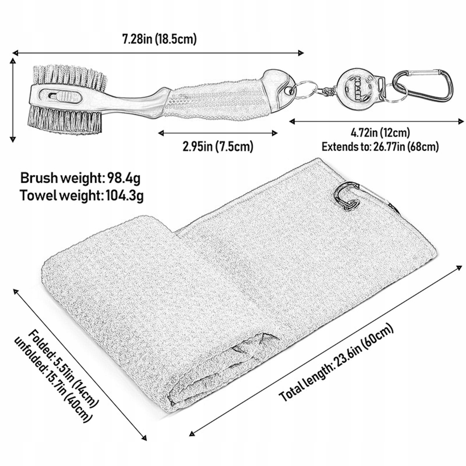 [Основна характеристика продукту] Пакет включає 1 щітку для гольфу з очисником для канавок і висувним затискачем, а також 1 рушник для гольфу.