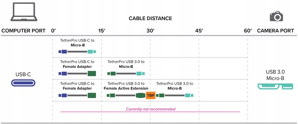 Довжина кабелю 4,6 м. Якщо відстань між вашими пристроями більша, подовжте її за допомогою активного адаптера TetherPro USB (малюнок нижче, 1 фут = 0,3 метра)